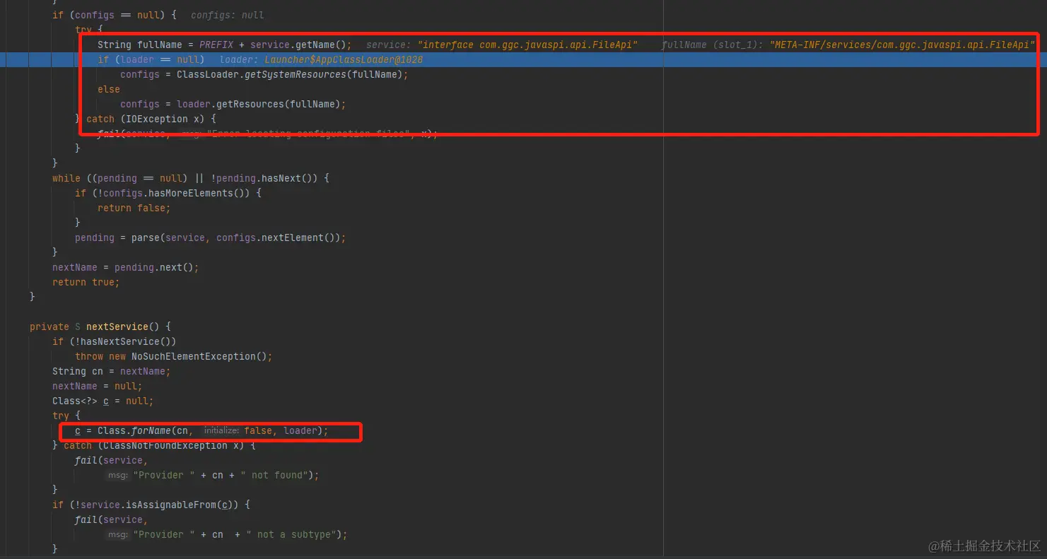 2)当在调用ServiceLoader.forEach()方法时,实际走的是LazyIterator,当在调用LazyIterator.hasNext() 时,在文件中读取到实际的服务实现类并把它们通过调用 Class.forName(String name, boolean initialize,ClassLoader loader)。
