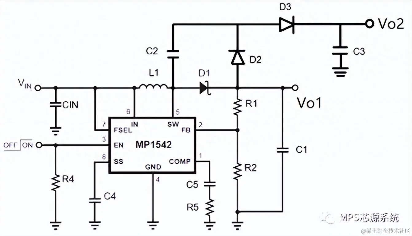 这个时候 Charge Pump 电路就可以完美展示它的优点,我们只需要在 Boost 的典型应用电路上增加一些元器件便可以实现 Vo2=2Vo1 。