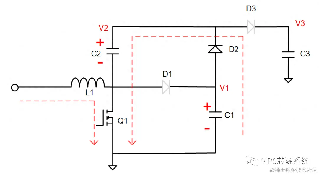 在 Q1 关断的时候,此时电容 C2 开始向输出传递能量,这样 C2 电容便充当了一个“搬运工”的角色,非常巧妙的实现了 V3=V2+V1=2V1