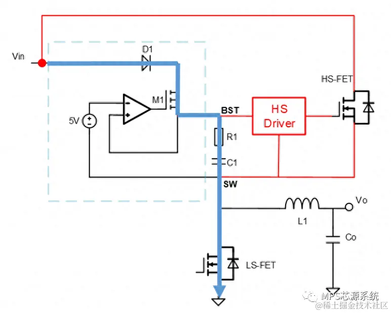 以 Buck 电路为例,我们知道为了驱动上管,满足 Vgs>Vth , 我们往往需要一个自举电路来抬升 gate 的电压,如图所示电容 C1 在一个开关周期内便完成了电荷的充放电过程,从而抬升了 gate 的电压。