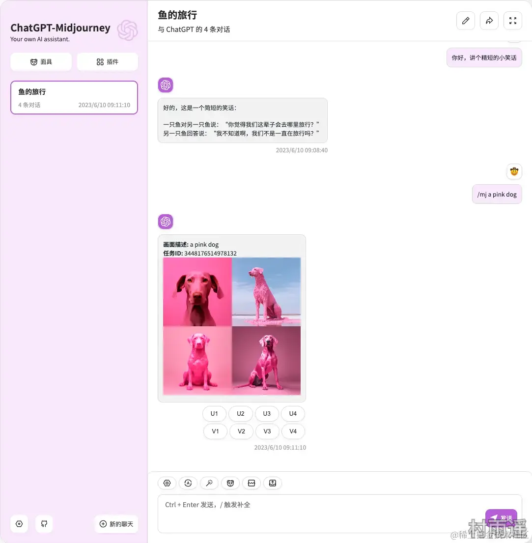 ChatGPT-Next-Web所有功能 midjourneyimagin想象midjourneyupscale放大midjourneyvariation变幻midjourneydescribe识图midjourneyblend混图midjourney垫图- 绘图进度百分比、实时图像显示