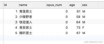 INSERT INTO t1 (`name`,age,sex) VALUES ('青莲居士',61,'M');