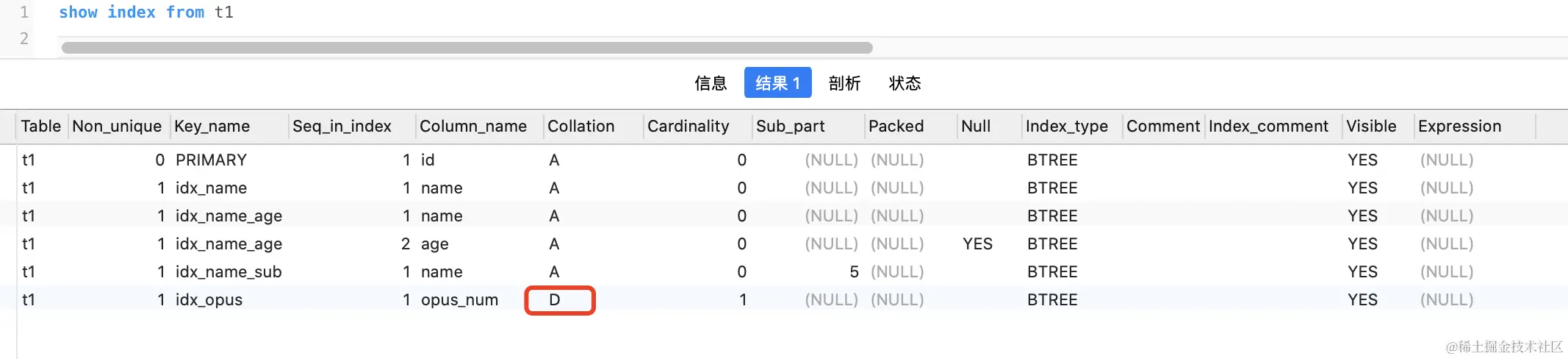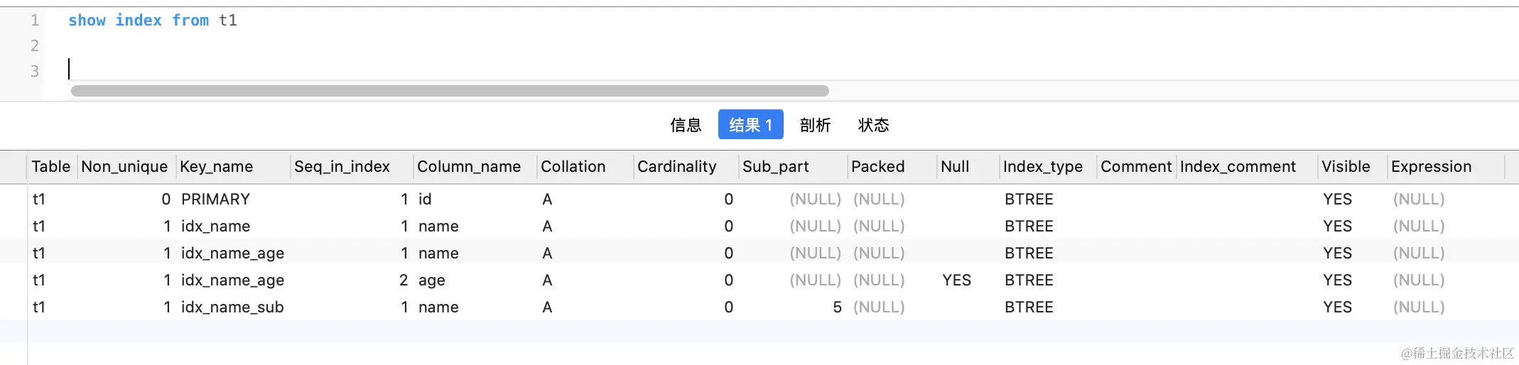 SELECT * FROM information_schema.STATISTICS WHERE TABLE_NAME = "t1" 与 show index from t1 作用相似,且会返回更多的字段信息