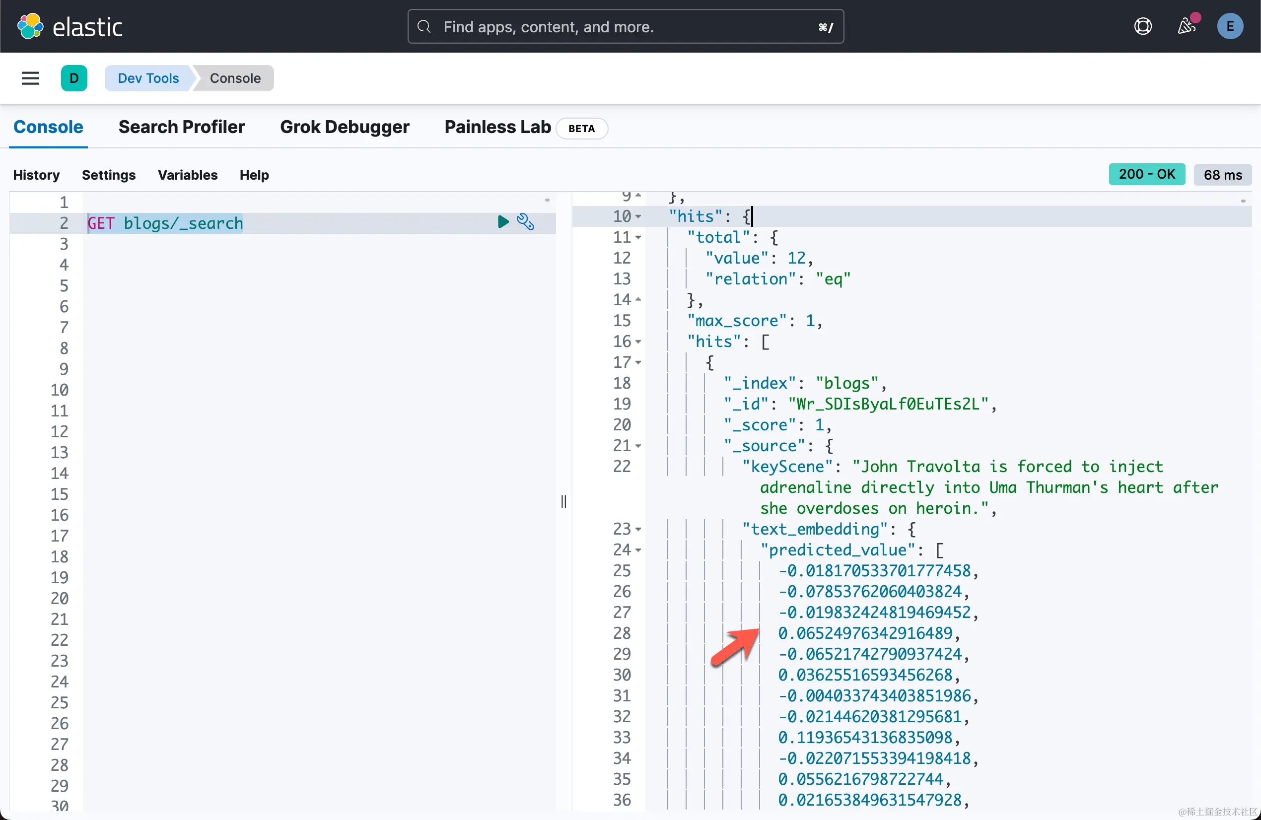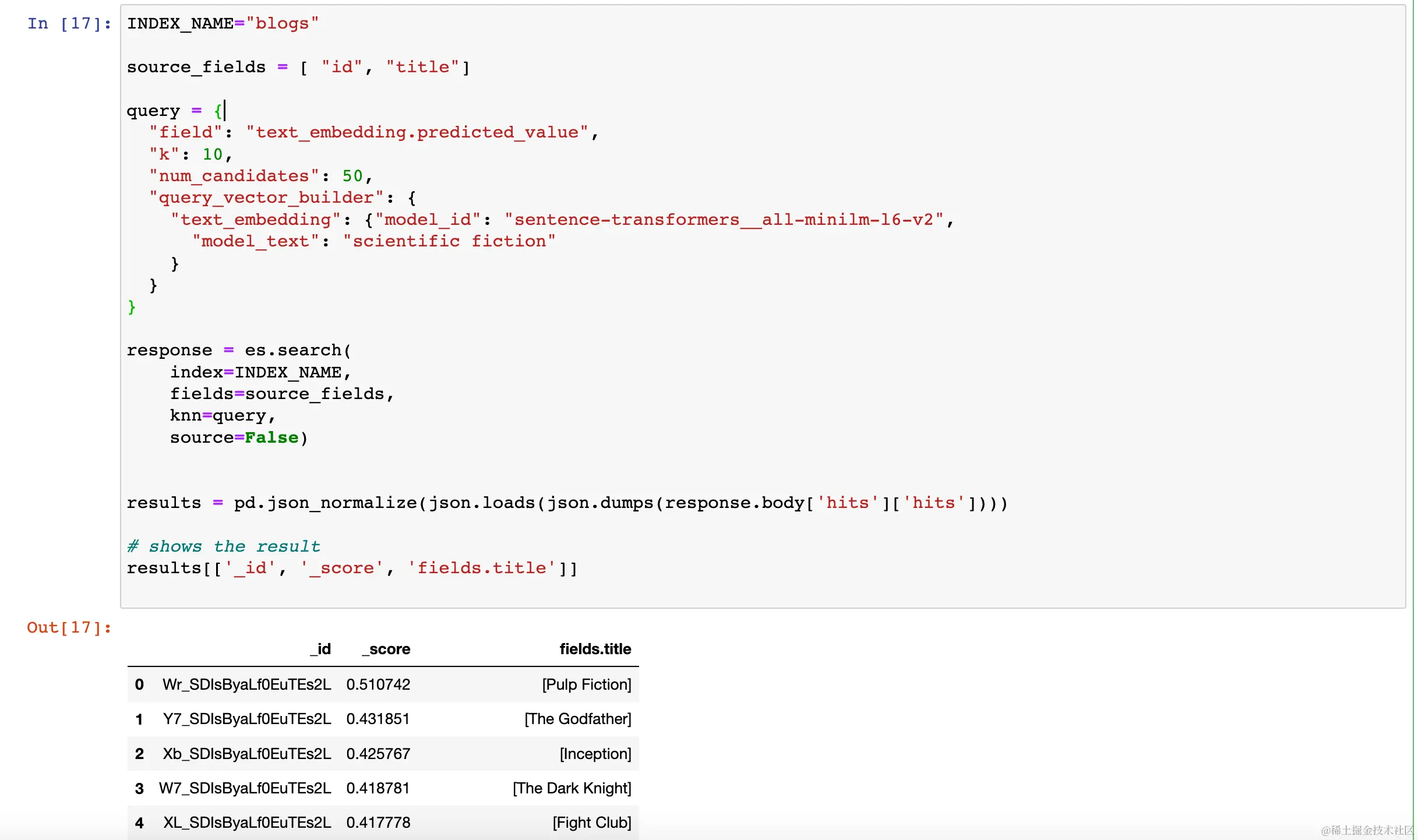 下一步是运行查询来搜索相关博客。 该示例查询使用我们上传到 Elasticsearch Sentence-transformers__all-minilm-l6-v2 的模型来搜索 “model_text”: “scientific fiction”。