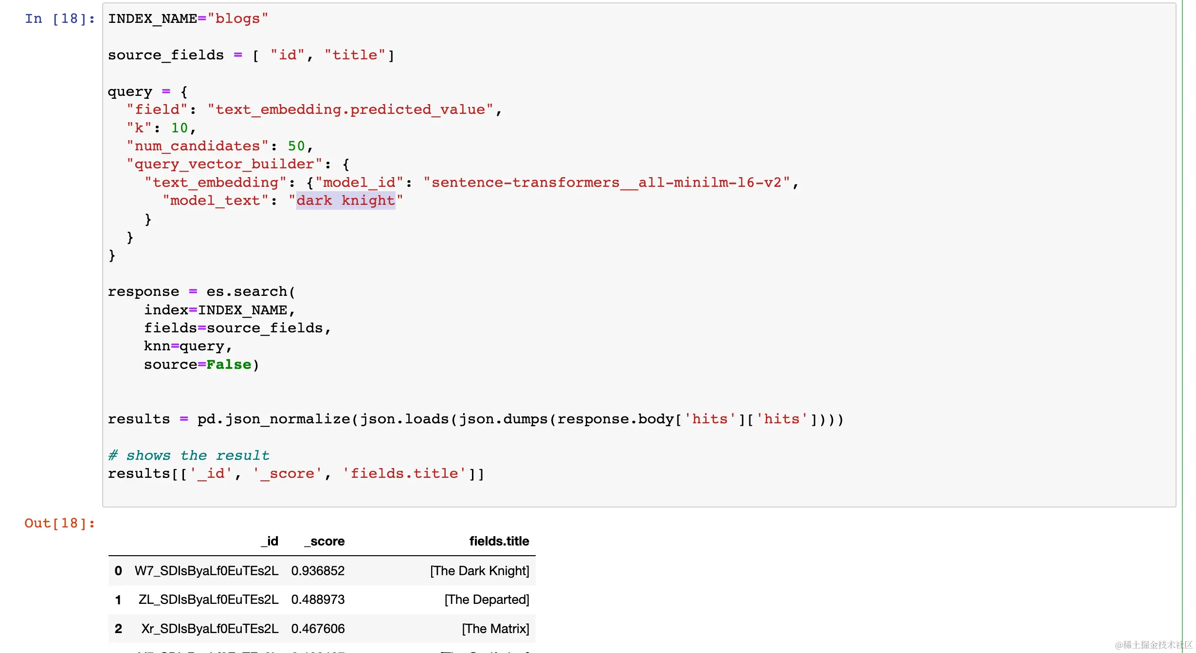 该过程是一个查询,尽管它内部包含两个任务。 首先,查询将使用 NLP 模型为您的搜索文本生成一个向量,然后传递该向量以在数据集上进行搜索。