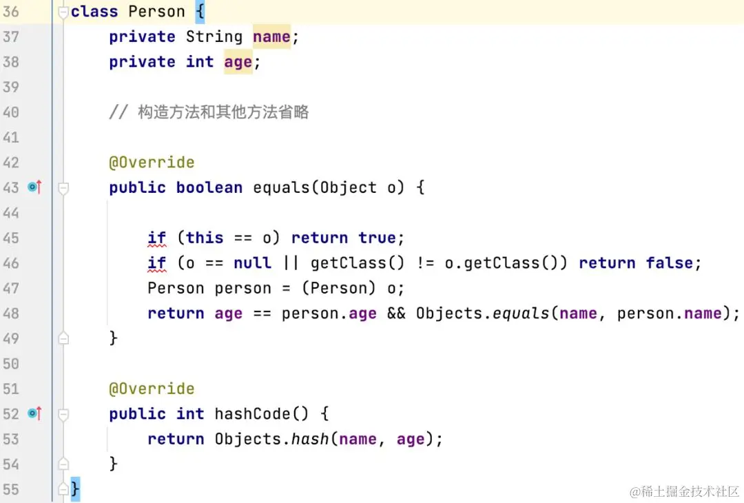 在这个示例中,我们重写了 equals 方法,比较了 name 和 age 属性是否相等,然后重写了 hashCode 方法,使用了 Objects.hash 方法来计算哈希码。