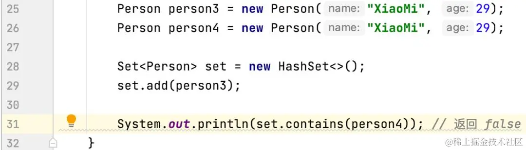 在这个示例中,尽管 person3 和 person4 的内容相同,但由于它们具有不同的哈希码,set.contains(person4) 返回 false。这是因为哈希表无法正确定位到 person4。
