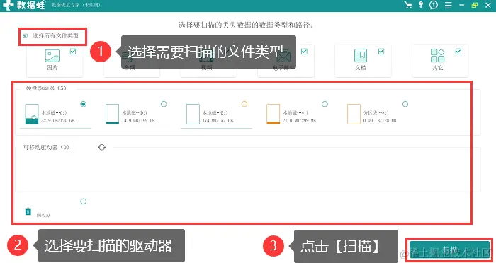 2.对需要扫描的文件类型进行选择(即强制删除时误删的文件类型),并对文件所在的磁盘进行选择,操作完成后,点击【扫描】;