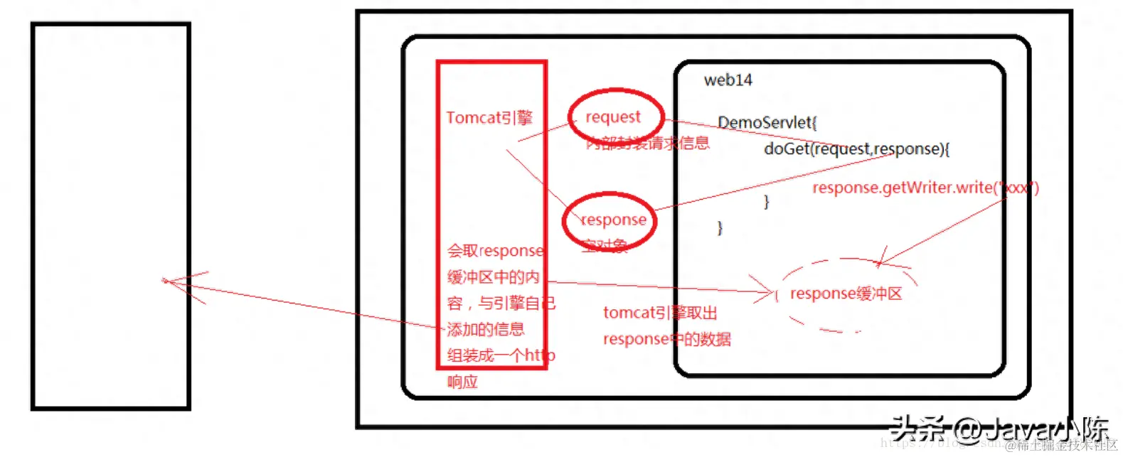 获得字节流,通过该字节流的write(byte[] bytes)可以向response缓冲区中写入字节,再由Tomcat服务器将字节内容组成Http响应返回给浏览器。