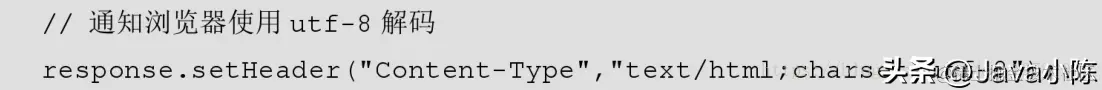 通过更改response的编码方式为UTF-8,仍然无法解决乱码问题,因为发送端服务端虽然改变了编码方式为UTF-8,但是接收端浏览器端仍然使用GB2312编码方式解码,还是无法还原正常的中文,因此还需要告知浏览器端使用UTF-8编码去解码。