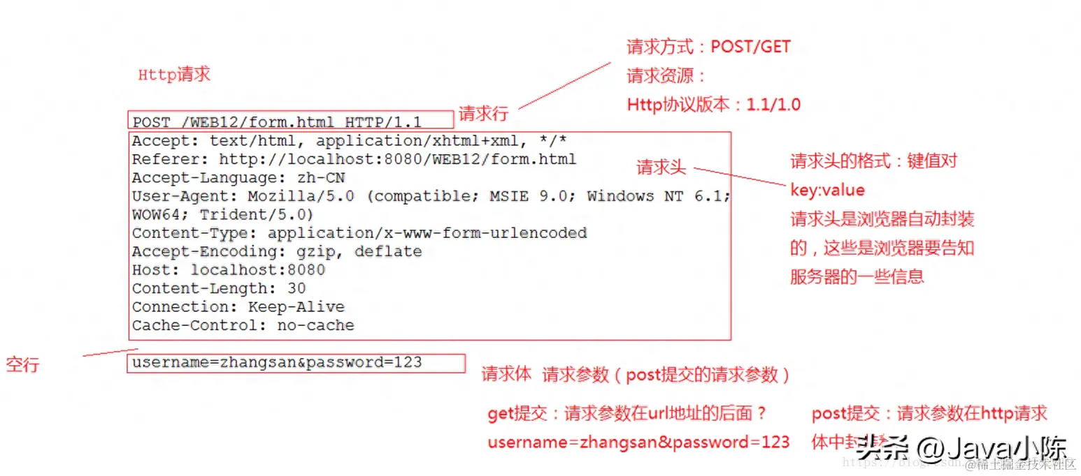 因为Request代表请求,所以我们可以通过该对象分别获得HTTP请求的请求行,请求头和请求体。