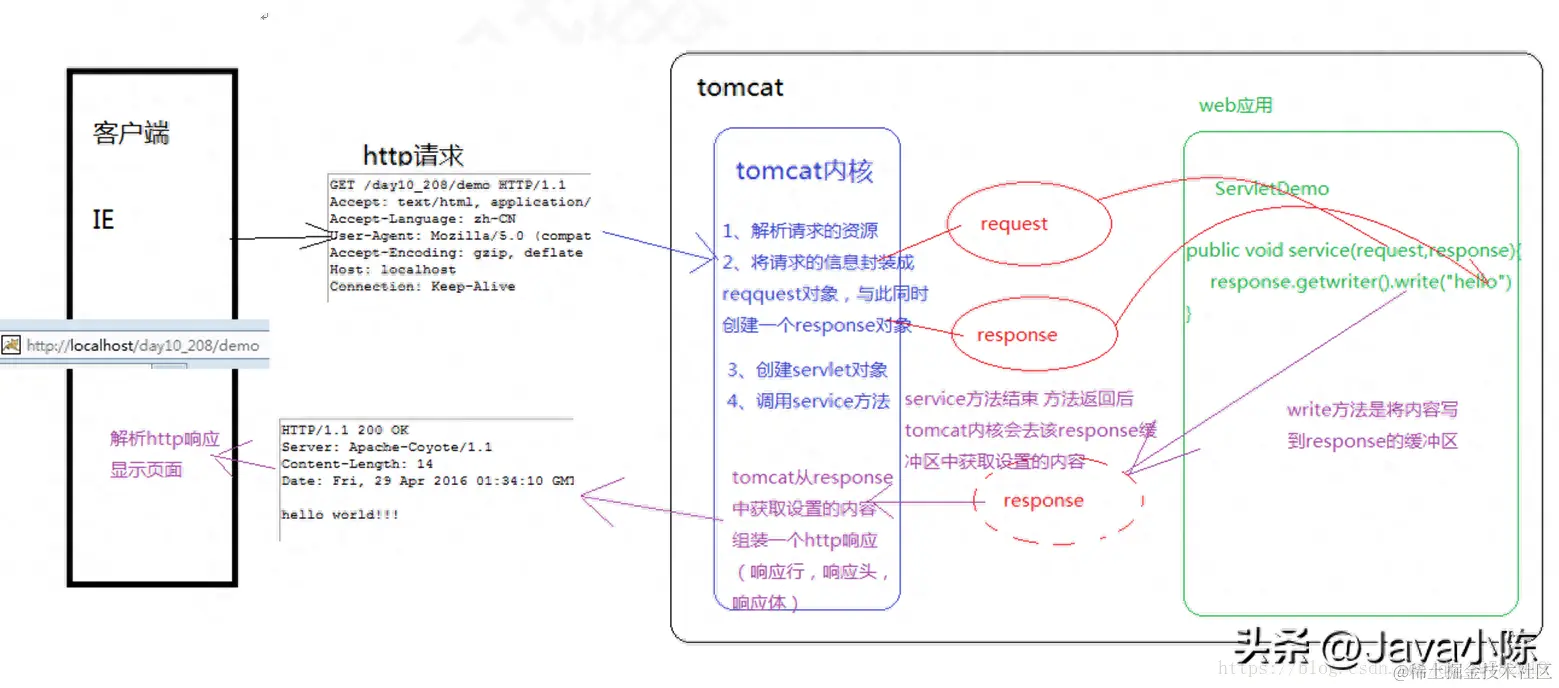 获得字符流,通过字符流的write(String s)方法可以将字符串设置到response 缓冲区中,随后Tomcat会将response缓冲区中的内容组装成Http响应返回给浏览器端。