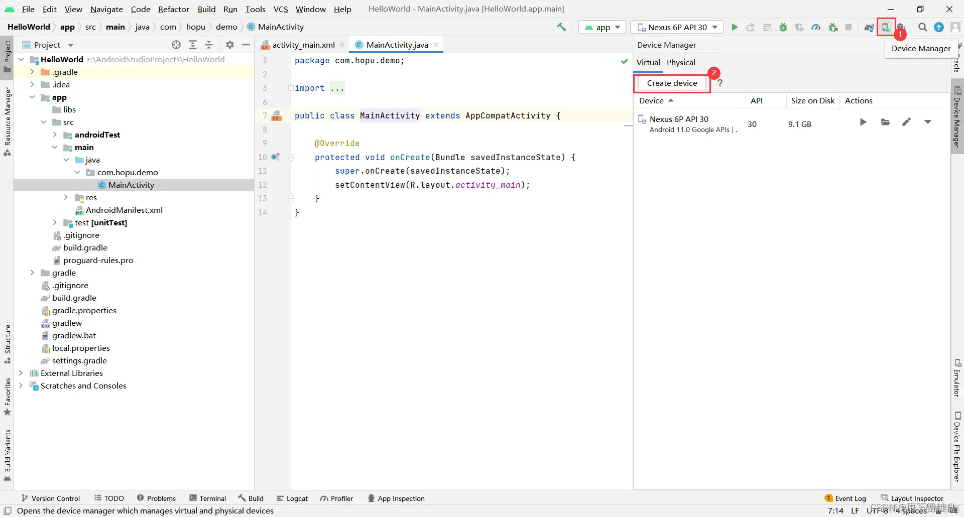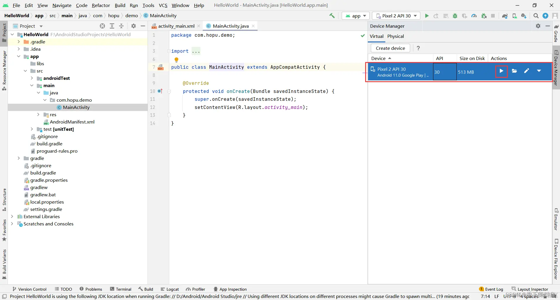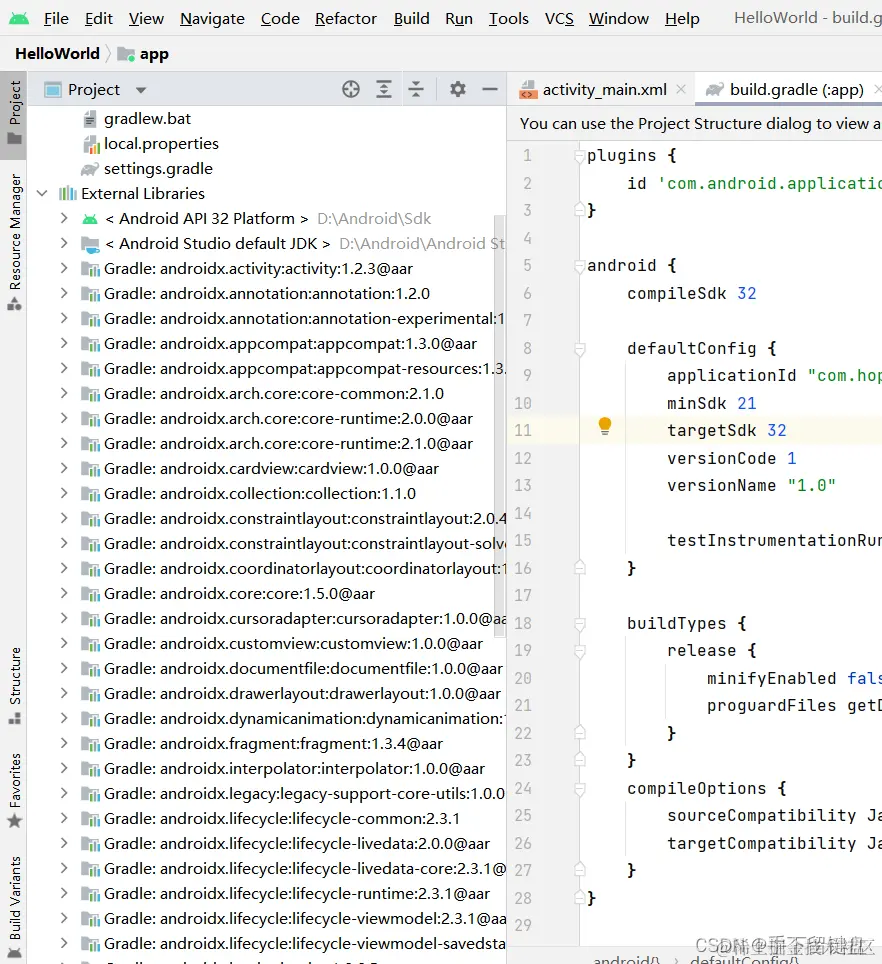 3 Android Studio中的gradle的介绍3.1 Gradle是啥?gradle是一个基于Apache Ant和Apache Maven概念的项目自动化建构工具。 所谓的构建过程就是:编译,测试,依赖管理,打包,部署。以前我们开发是手动导入jar包的,类似于面向过程,一步一步来,缺什么包就导什么包,很麻烦,容易出错,jar包版本还不统一,需要关心jar包与jar包之间的依赖。通过采用gradle的构建方式,只需通过complie xxxxx引入一个jar包,然后这个jar包所依赖的其他jar包gradle会自动帮引入,无需关心jar包与jar包之间的依赖,在什么地方以什么形式引入外部jar包,都委托给gradle管理了,体现了面象对象的思想,无需关心内部实现过程,直接引入就可。(注意Gradle不是一种编程语言,它不能帮你实现软件中的任何实际功能) 3.2 自动化构建工具有哪些?Ant 2000年诞生,主要是编译代码,测试代码。 Maven 2007年诞生,主要是编译测试,依赖管理。 Gradle 2012年诞生 主要是是编译测试,依赖管理,DSL自定义扩展任务。 3.3 Android Studio中的默认工具是GradleAndroid studio的默认插件是Gradle,或许是因为Gradle编译速度比Maven 快很多,而且Gradle完全兼容kotlin语言。当我们新建一个android 项目,gradle已经默认配置好了,打开gradle-wrapper.properties文件,查看配置信息: 可以看到distributionUrl=services.gradle.org/distributio…说明默认使用的是gradle 5.1.1 的版本,当然可以改成我们本地有的版本,distributionUrl=file:///+gradle的本地路径,例如:distributionUrl=file:///c:/tools/gradle-5.6.4.zip就可以了。 android gradle插件详解地址:developer.android.com/studio/rele… 3.4 build.gradlebuild.gradle文件分别在项目目录下和对应module目录都有存在。 下图是项目目录下的build.gradle: 接下来是module目录的build.gradle: module目录下的的build.gradle里的dependencies {…}里面的依赖,是单单一个模块本身所需的依赖!是程序运行的编译依赖! 在External Libraries文件夹下,如图 可以看到项目添加的所有依赖,包括子依赖都会显示在里面。除build.gradle里的dependencies {…}里面添加的依赖之外的依赖都是子依赖。子依赖都是gradle智能自动的帮你添加的,它检查到你主动添加的依赖,又依赖于其他依赖,就会帮你加上。另外当gradle检查到依赖间有冲突时,出现依赖间多次引用相同jar包(只能将库里的源码打进去,而资源什么的不能打进去)、aar包(自动的将资源文件和源码一起打进去,不用担心资源缺失的问题),它只会默认选择版本较高的添加,不会重复添加。这就是gradle出色的依赖管理。 4 使用Android Studio创建虚拟机
