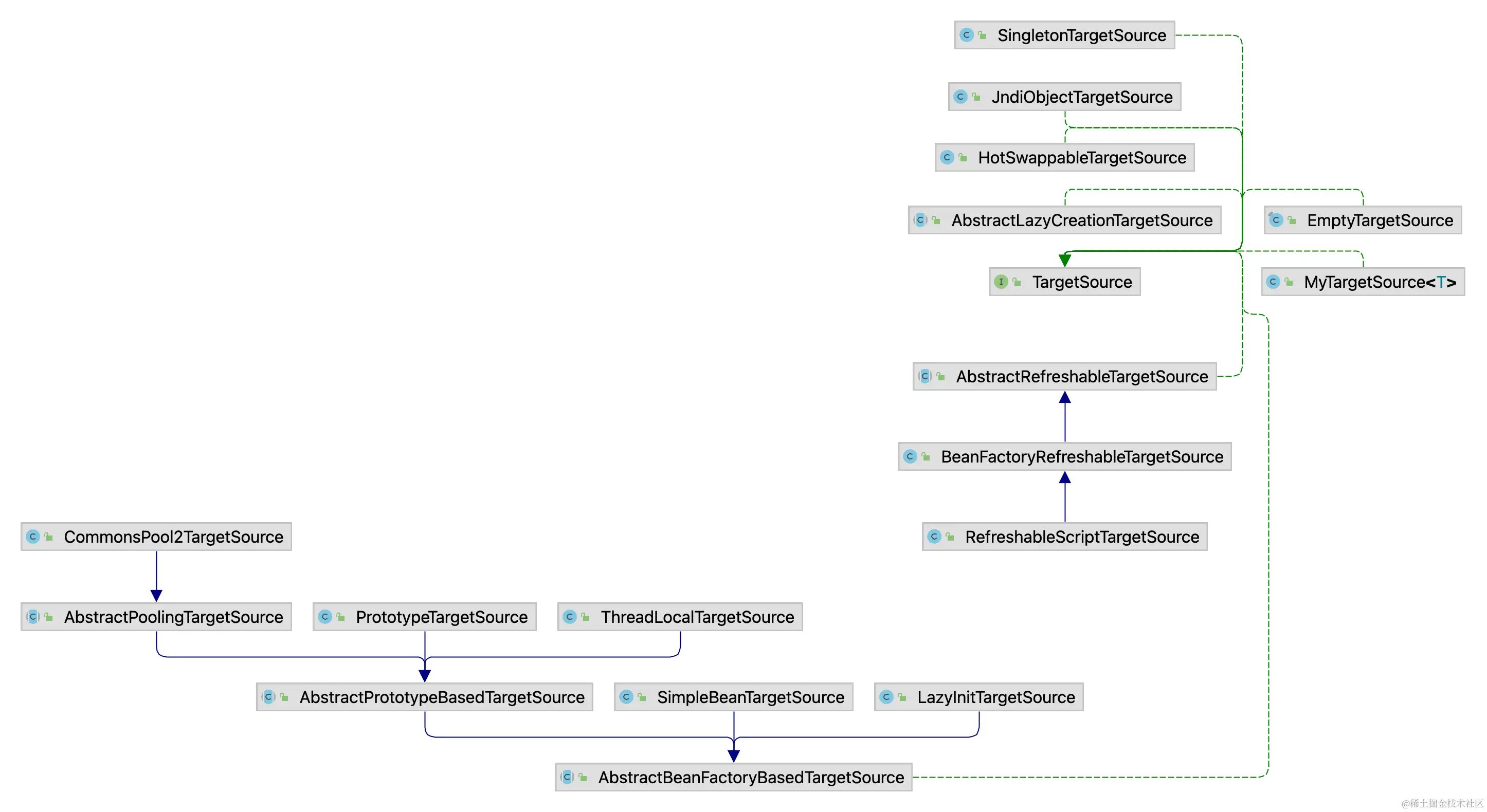 在 Spring AOP 中,否则处理代理对象的接口是 TargetSource,TargetSource 有诸多实现类,不同实现类具备不同的能力: