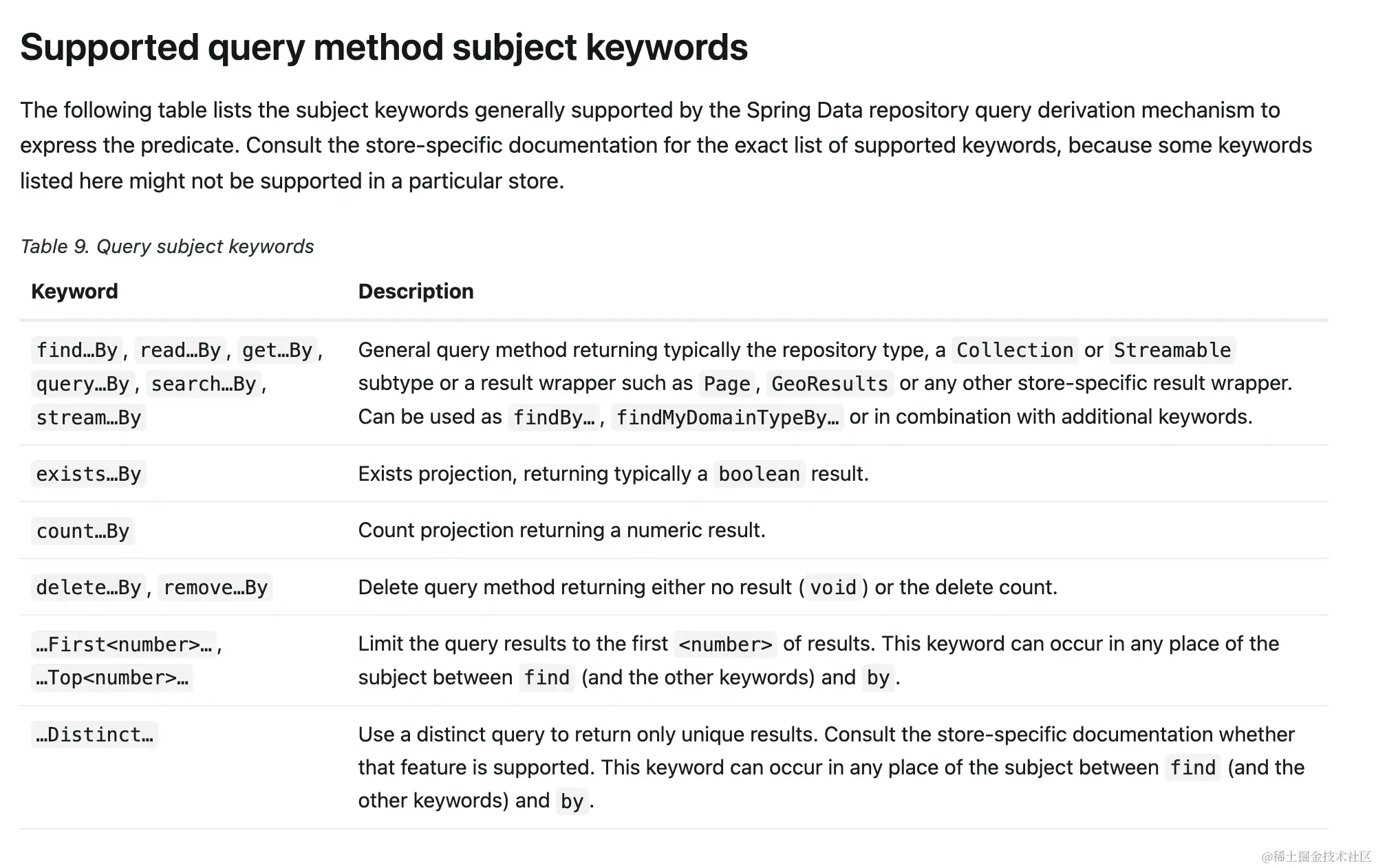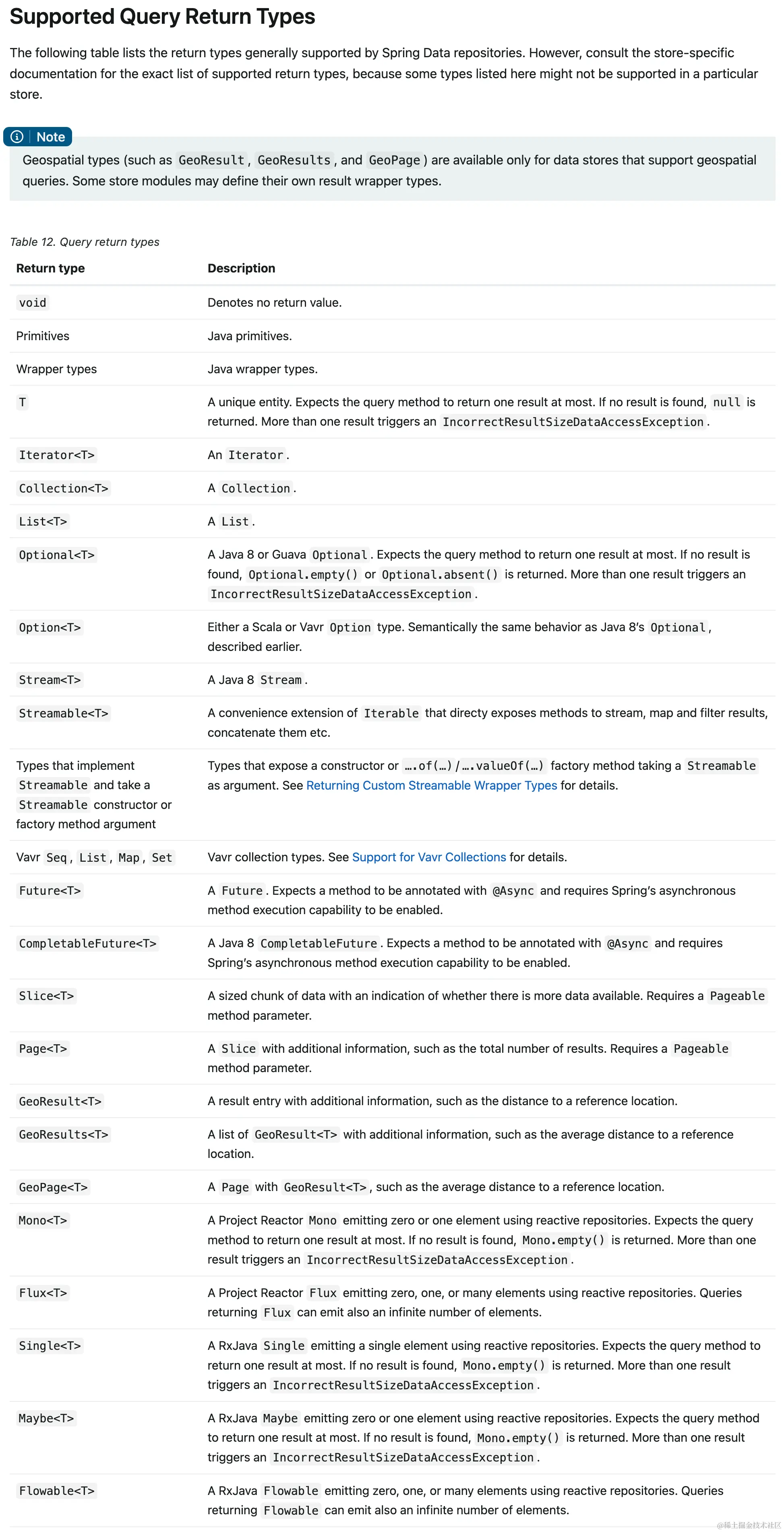 对于 Repository 方法的返回类型,JPA 会帮助开发去匹配。目前支持的返回值类型可参考