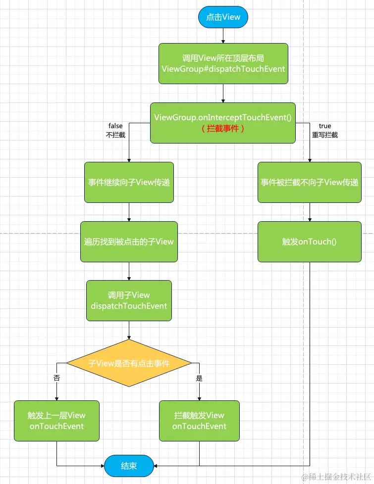 - 子View会先调用onInterceptTouchEvent方法来判断是否需要拦截该事件。