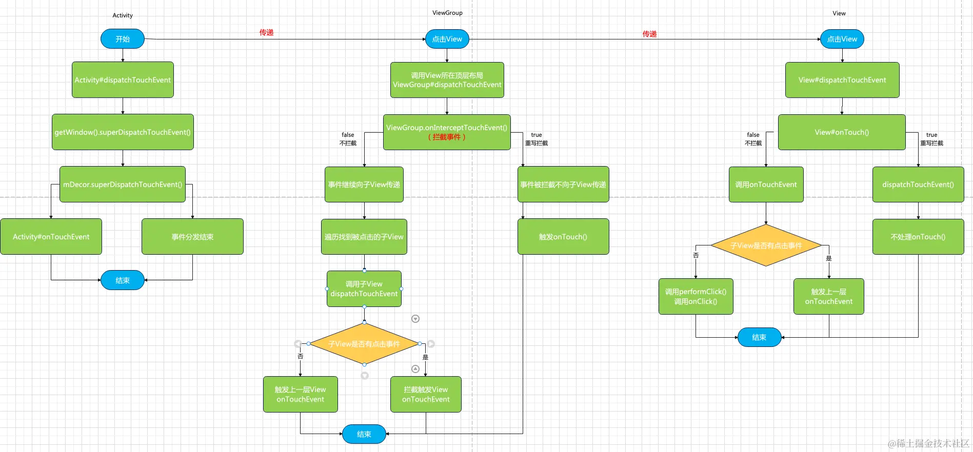 事件的拦截:在确定了接收事件的子View或者子ViewGroup后,ViewGroup会调用该子View或者子ViewGroup的dispatchTouchEvent()方法,将事件传递给它们。在这个过程中,如果父ViewGroup需要拦截事件,可以通过重写onInterceptTouchEvent()方法来实现。如果父ViewGroup拦截了事件,那么该事件将不会传递给子View或者子ViewGroup,而是由父ViewGroup来处理。