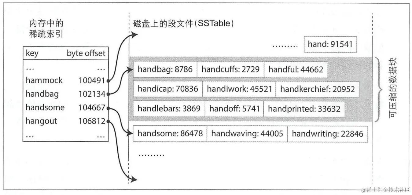 磁盘上的是追加写入,key是无序的。而**SSTable(Sorted String Table)**就是按key进行排序。