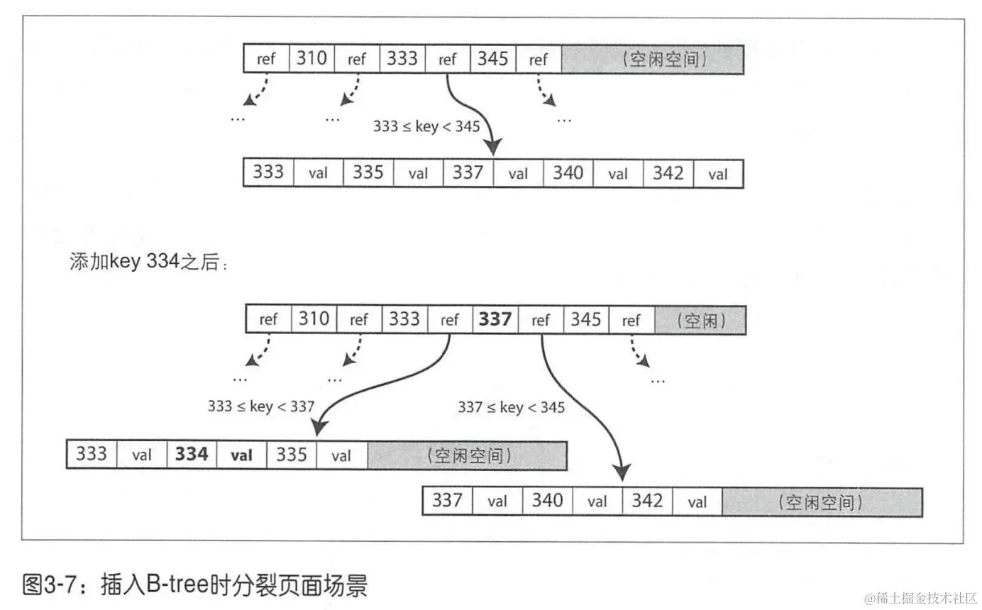 插入 or 更新。和查找过程一样,定位到原 Key 所在页,插入或者更新后,将页完整写回。如果页剩余空间不够,则分裂后写入。