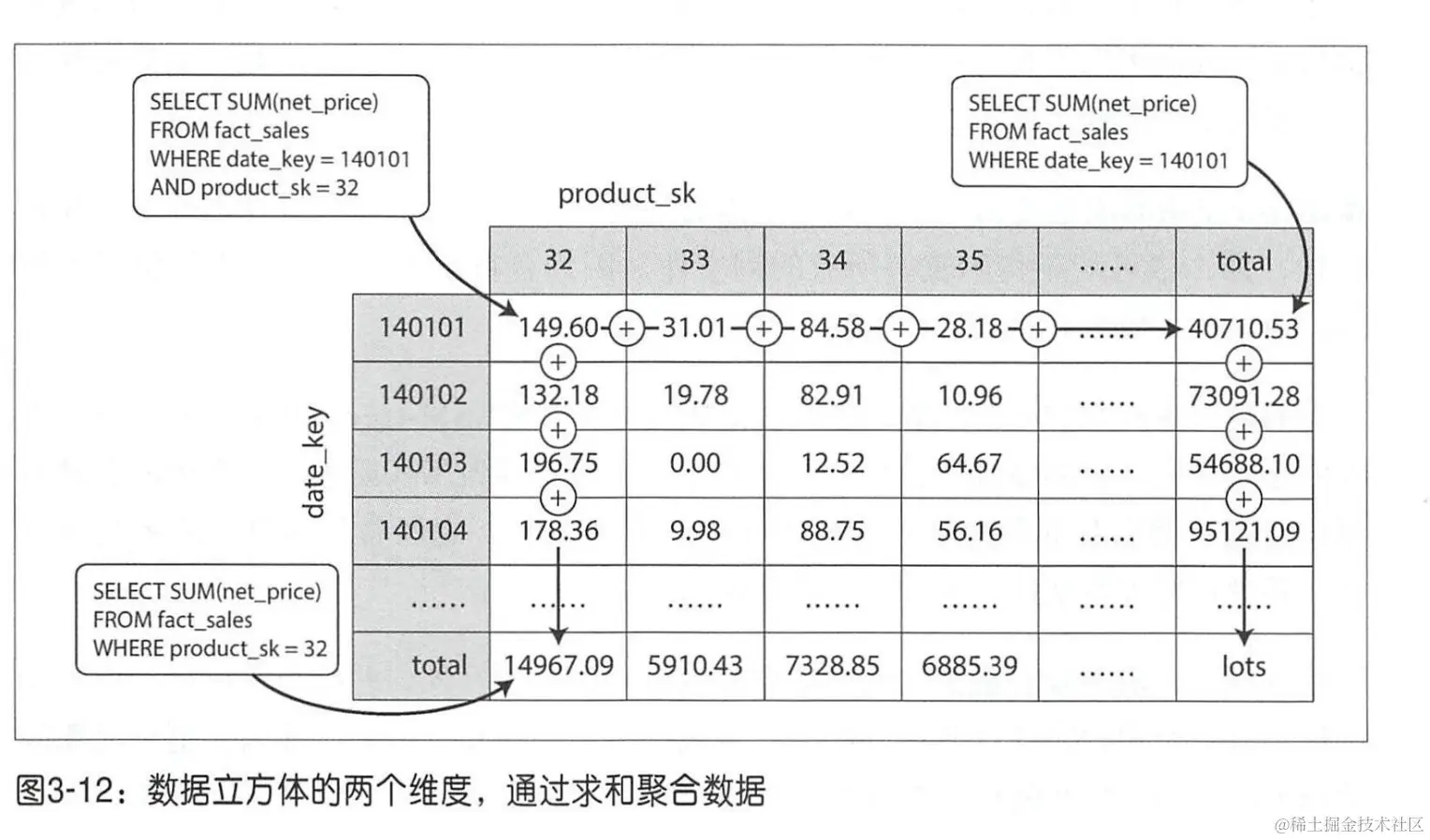 上图是一个按日期和产品分类两个维度进行加和的数据立方,当针对日期和产品进行汇总查询时,由于该表的存在,就会变得非常快。