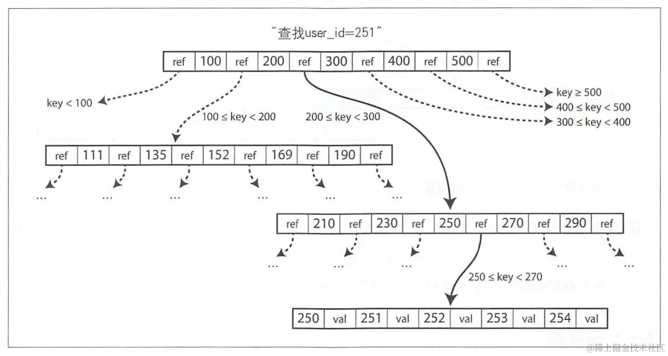 查找。从根节点出发,进行二分查找,然后加载新的页到内存中,继续二分,直到命中或者到叶子节点。查找复杂度,树的高度—— O(lgn),影响树高度的因素:分支因子(分叉数,通常是几百个)。