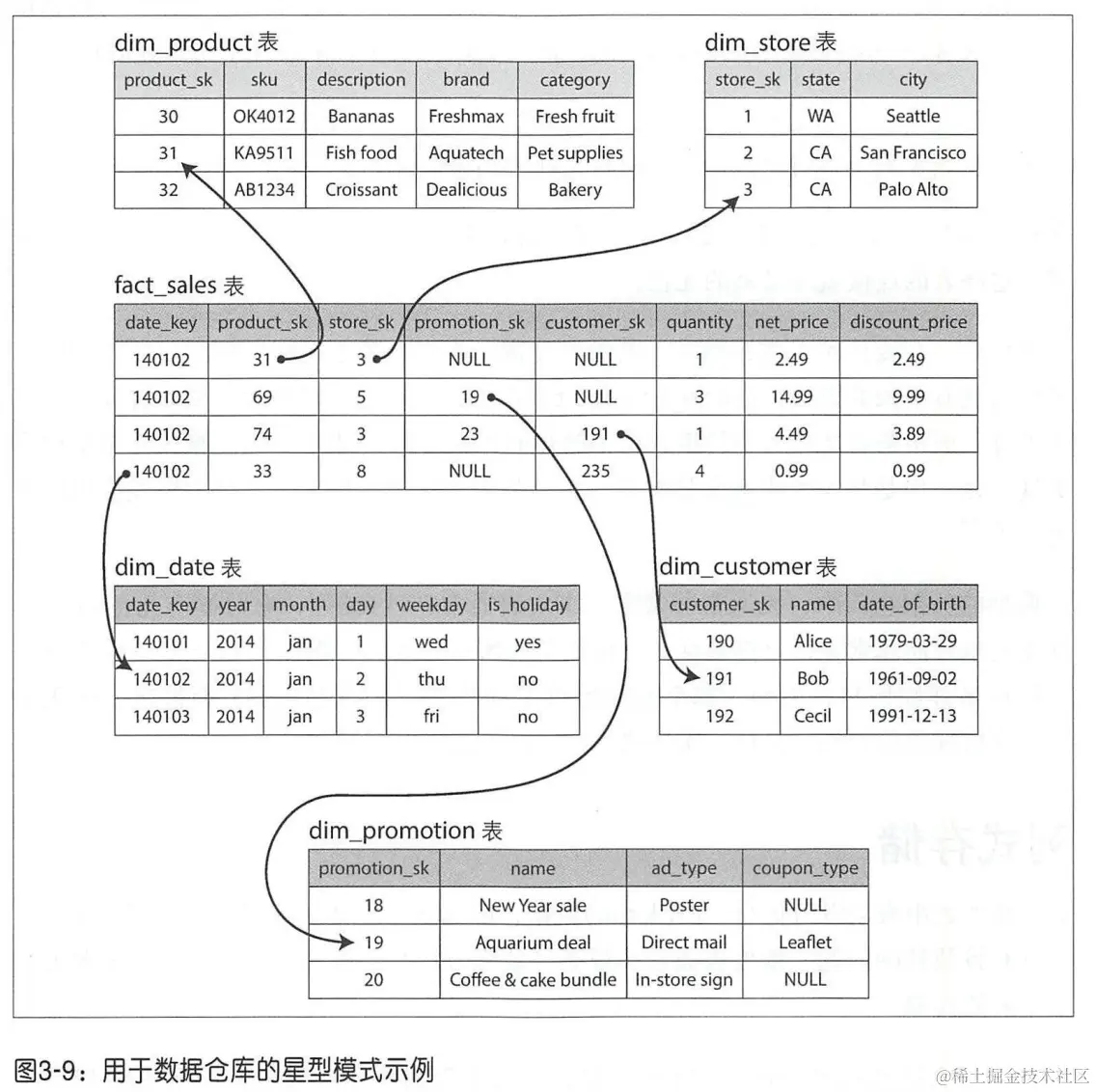 当然,现实中,一个表中常常有多个维度,比如 3-9 中有日期、产品、商店、促销和客户五个维度。但构建数据立方的意义和方法都是相似的。