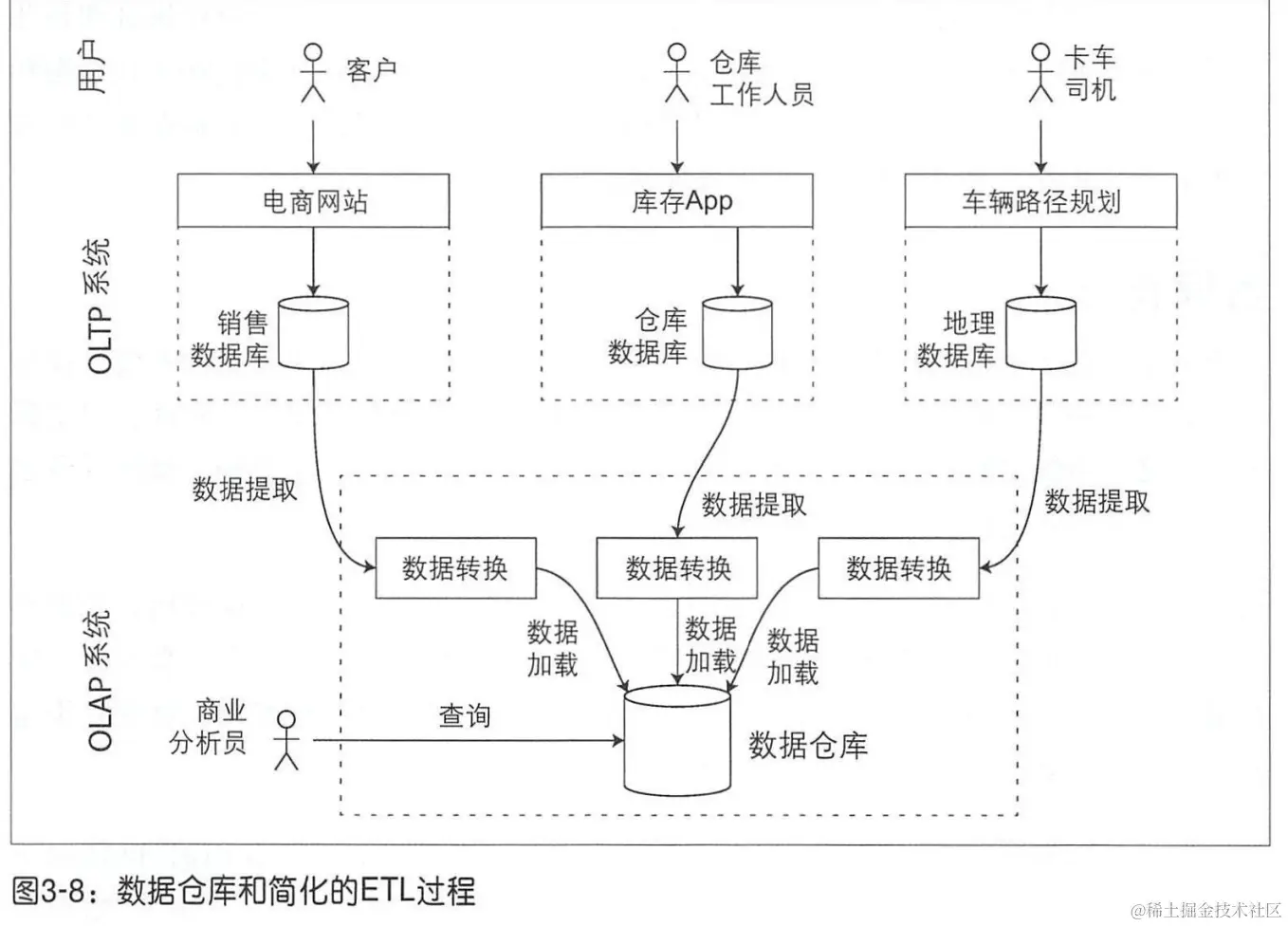 数据导入数据仓库的过程称为ETL:extract-transform-load。(提取-转换-加载)
