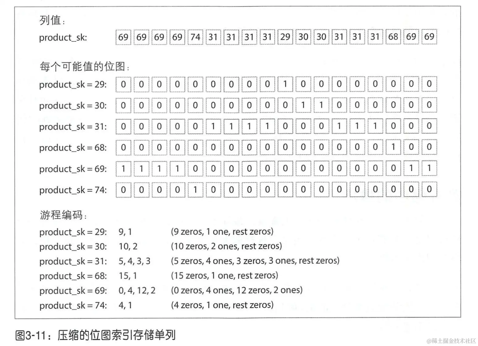 - 使用一个小技巧,将信息进一步压缩。比如将同值项合并后,肯定是 0 1 交错出现,固定第一个值为 0,则交错出现的 0 和 1 的值也不用写了。则 product_sk = 29 编码变成 9,1,8