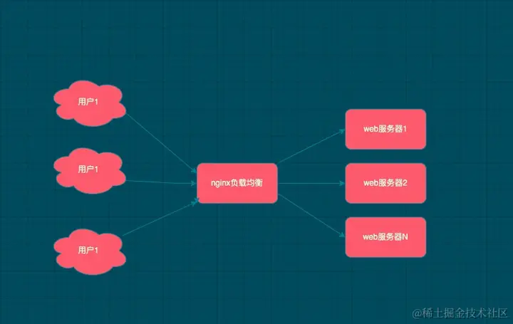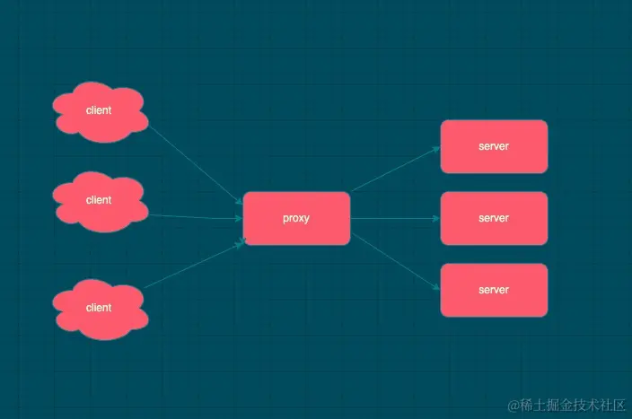 nginx 就是充当图中的 proxy。左边的3个 client 在请求时向 nginx 获取内容,用户是感受不到3台 server 存在的。