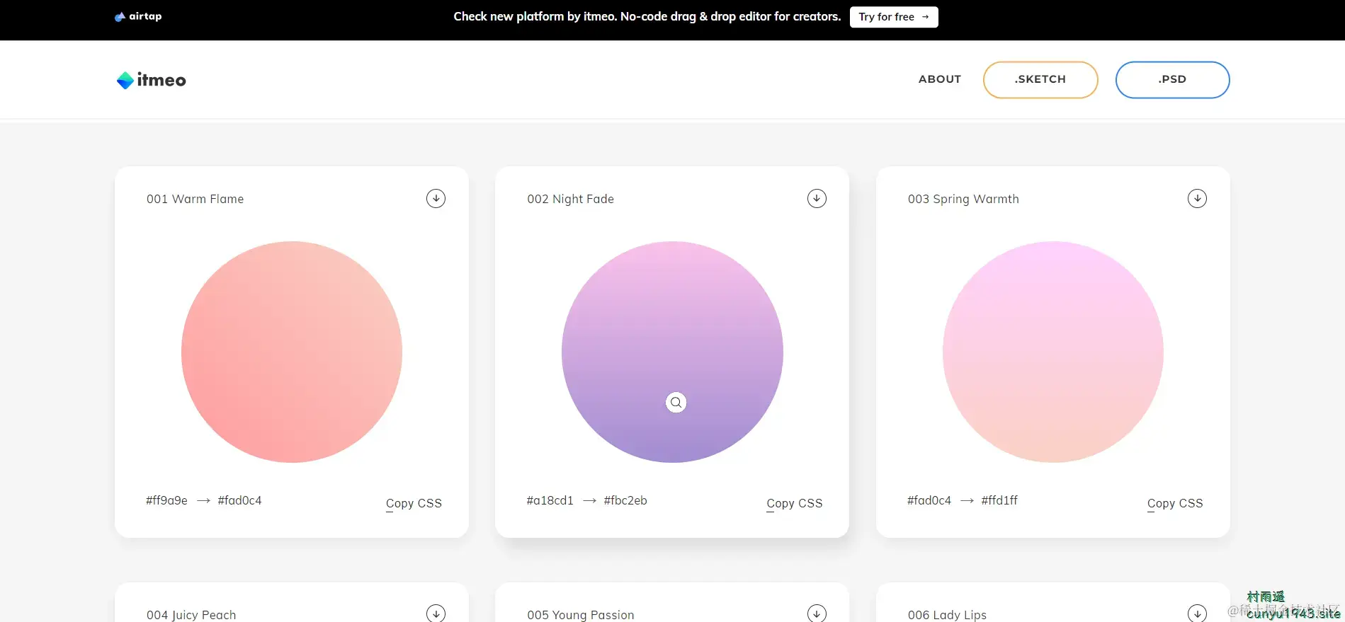 汇聚了 180 个线性渐变的配色方案,可以将其用作网站任何部分的内容背景,只需要通过 Copy CSS 即可将渐变赋值为一段 CSS 代码,而且免费供商业或者个人使用。