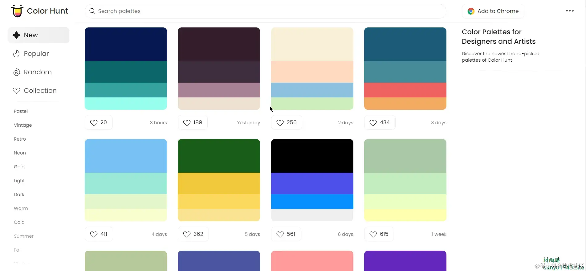 和 Color Hunt 类似的一个网站,只需要点击配色就会显示各个颜色的色值,但不同于 Color Hunt 的是,它不支持用户自己上传配色方案。