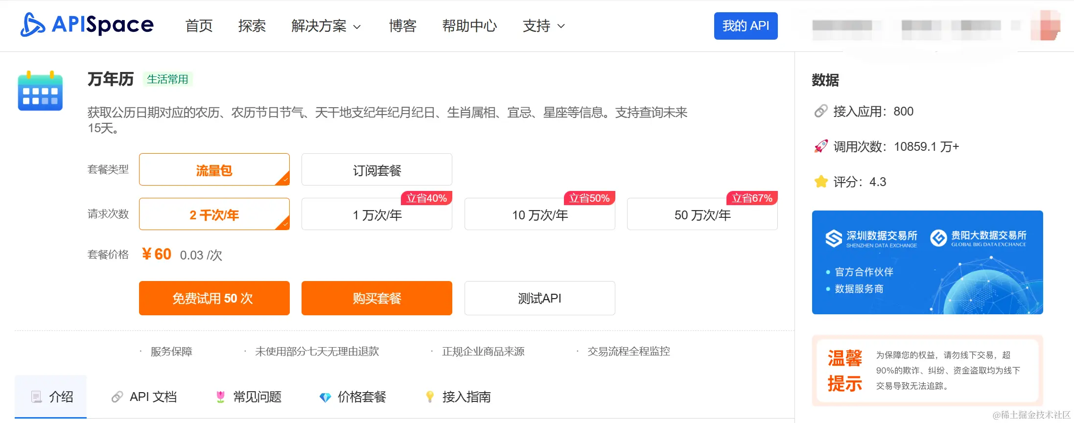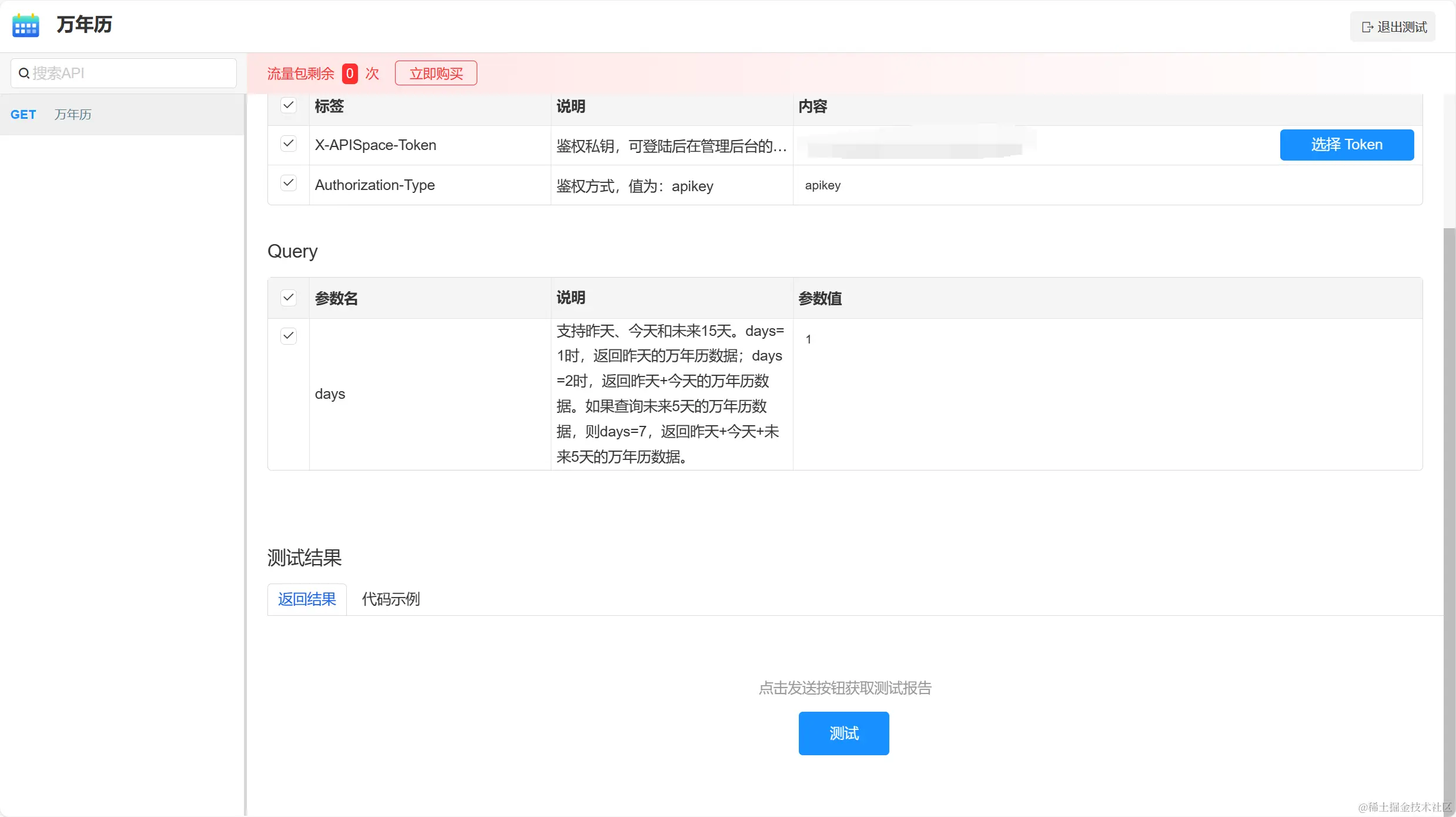 注册登录 APISpace,进入 万年历API 的接口详情页,申请接口。