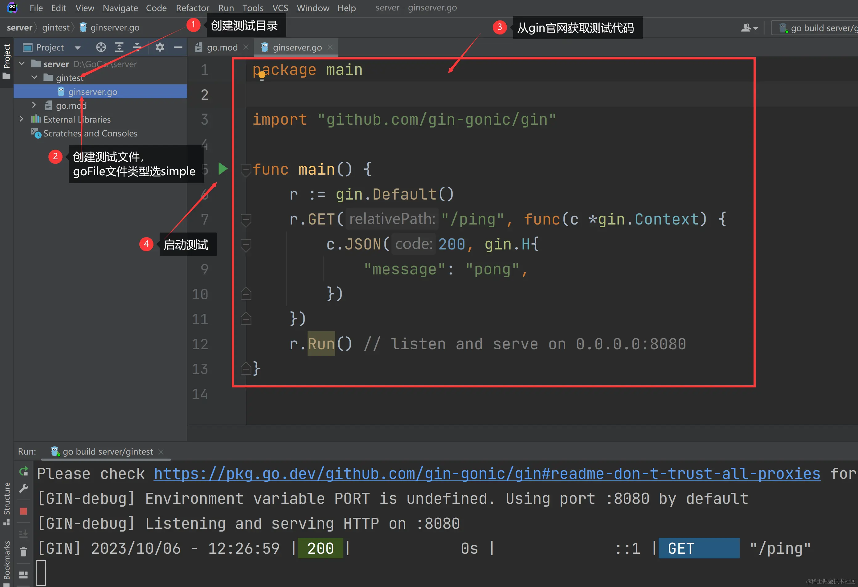 - 使用gin框架快速创建一个接口,通过接口的可用性,进而确定项目环境搭建的正确性。