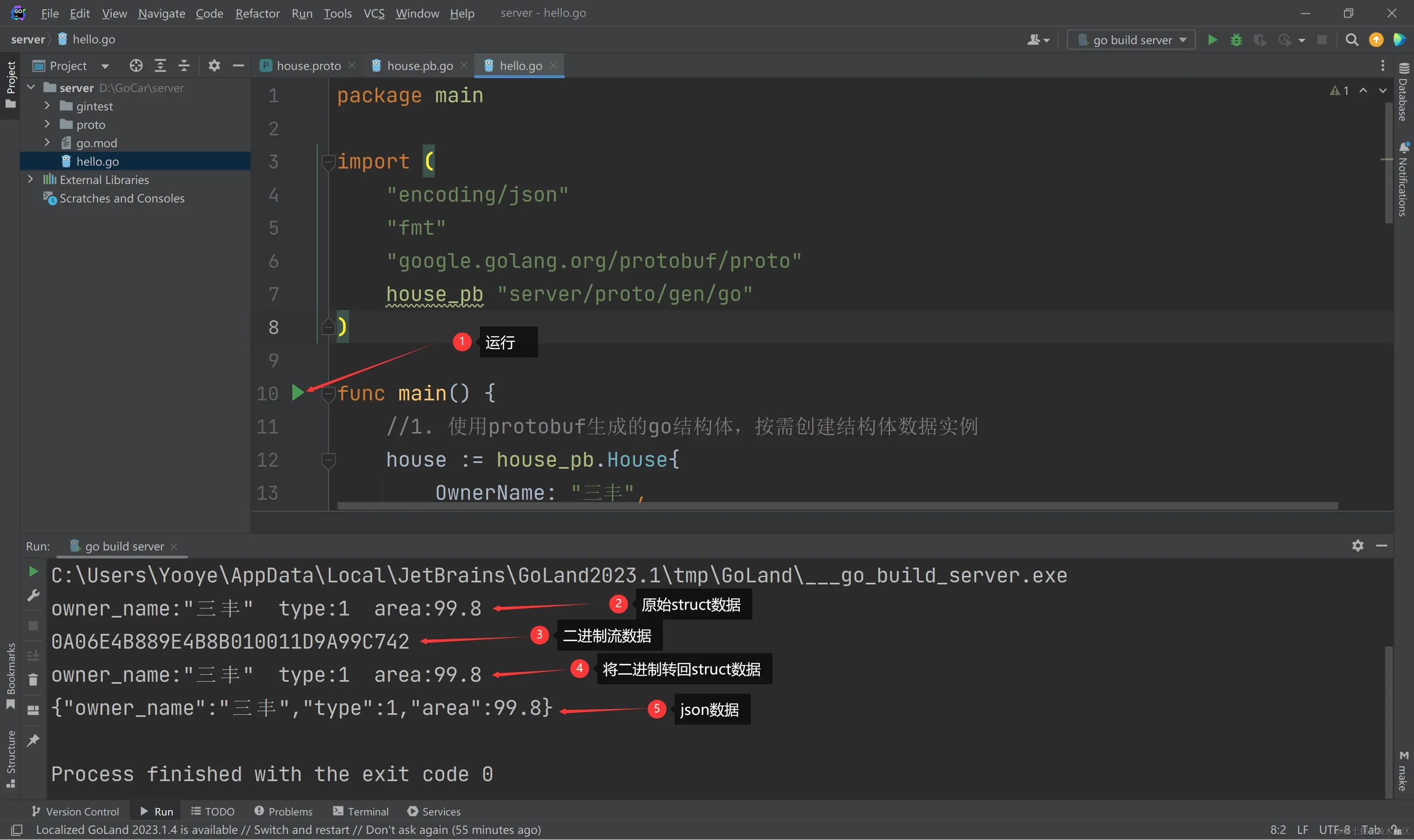 err = proto.Unmarshal(b, &house1) //4. 将二进制数据流,重新转回原始结构体格式