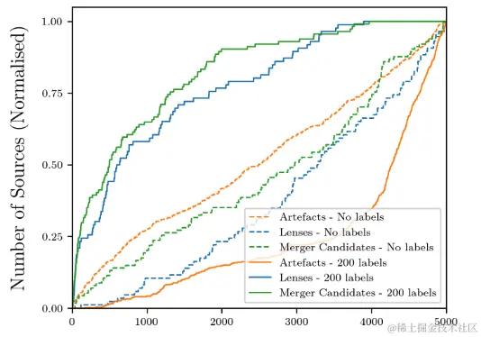 然而,对数据集中 2,000 个数据进行标注后,Astronomaly 能够通过主动学习迅速找到图像中的异常。当标注数为 4,000 时,Astronomaly 新找到的异常现象最多,随后开始下降,说明此时不需要额外的标注,可以增大数据集。