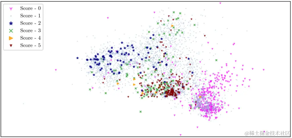 可以看到,0 分的伪迹和 5 分的异常现象在图中被分为紧密的团簇,说明两类图像都有很明显的特征。但同时,两类图像的分布很近,很容易让 iForest 算法产生误判。