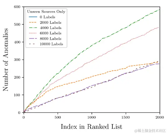 图中可以看到,当不对数据进行任何标注时,即无主动学习的 iForest 算法,结果中几乎看不到曲线,因为 iForest 算法在 2,000 个异常评分最高数据中只找到了一处异常。