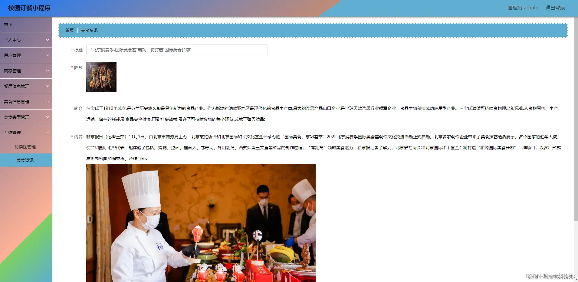 在美食资讯页面可以对索引、标题、图片等内容进行详情,修改或删除等操作,还可以对轮播图管理进行详细操作。
