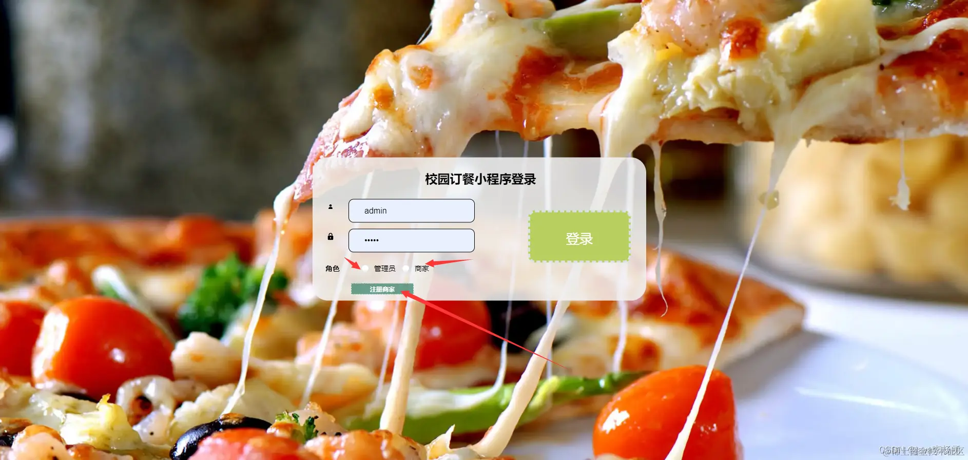系统后台登录,管理员和商家通过输入用户名、密码,选择角色并点击登录进行系统登录操作。