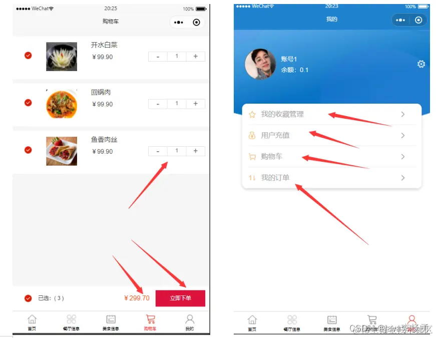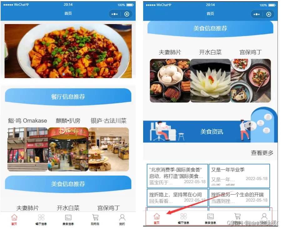 用户登陆小程序端,可以对首页、餐厅信息、美食信息、购物车、我的等功能进行详细操作。