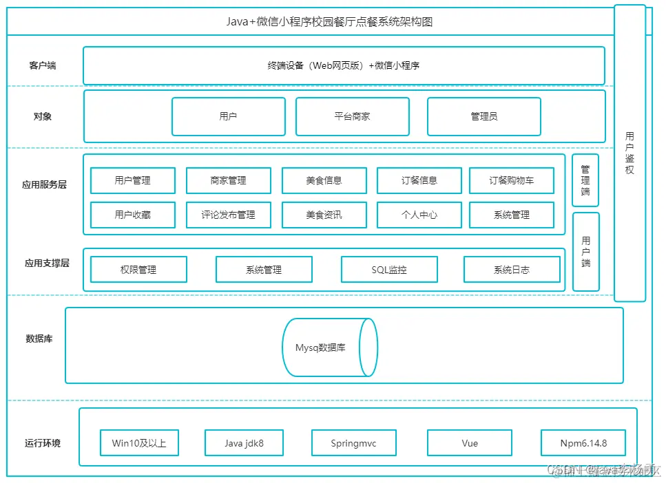 Java以Linux为基础并且使用Java语言进行开发的操作平台。Java的开放性让他允许所有人对系统进行修改和完善,这一点也让他在近些年成为便携设备上主要的操作系统。Java同时还内置了内置丰富的应用程序,比如电话、摄像头、播放器。这些都为在系统上开发程序提供了便利。该系统运用小程序完成前台的开发,包括登录注册、个性化特征的收集、用户使用我们这个校园订餐小程序只需一个Java手机就可以使用了,而且所有操作都是我们熟悉的操作手法。所有的操作通过手机就可以完成,用户不需培训,只要稍微提示一下即可。所以开发校园订餐小程序使用小程序技术不仅方便了开发者而且用户使用起来也非常方便,可以说是相对来说比较完美的开发平台了。