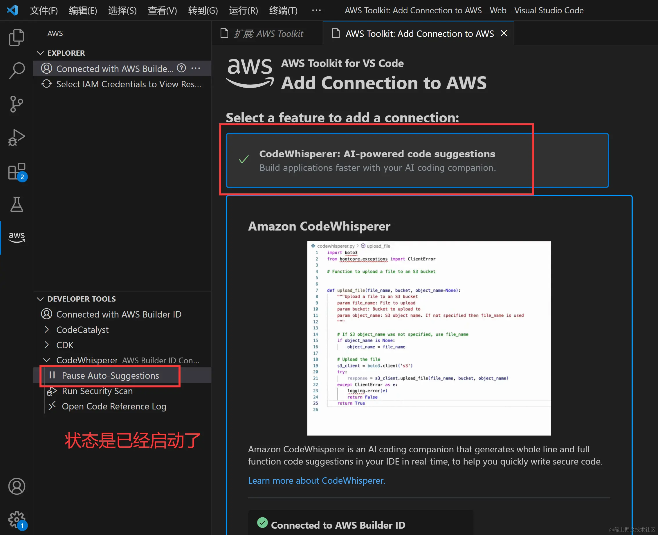 查看【AWS Toolkit】在【Visual Studio Code】中的状态,这里已经不是【Start了】。