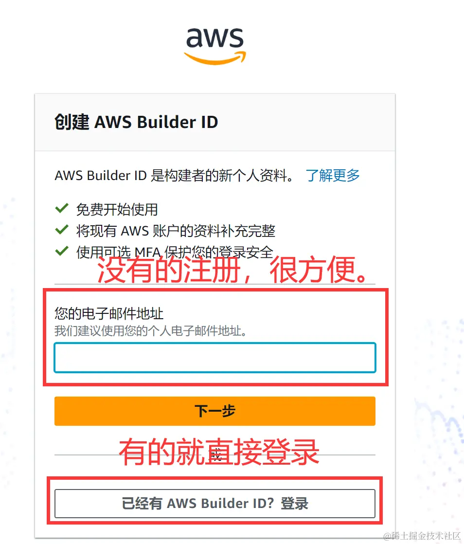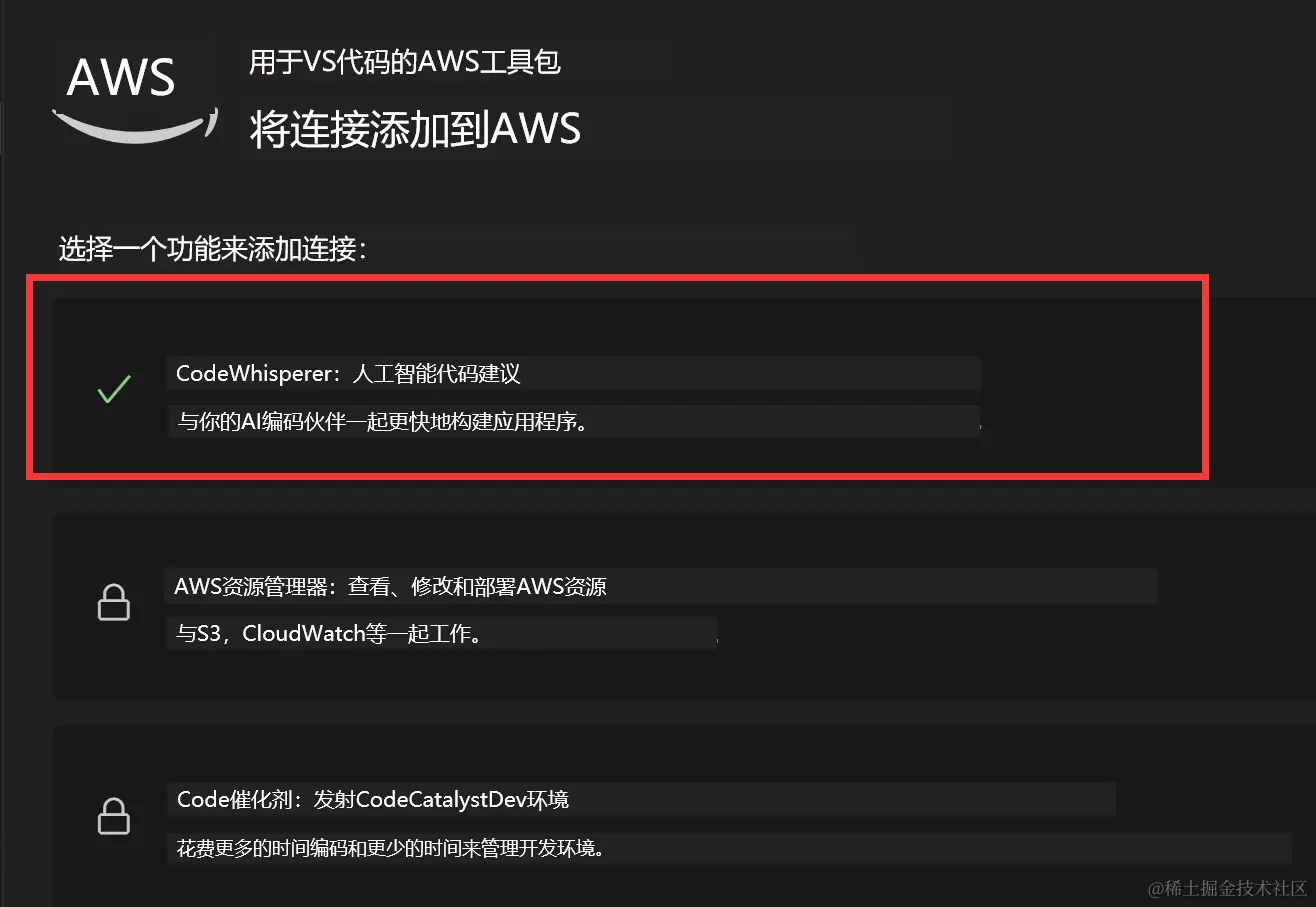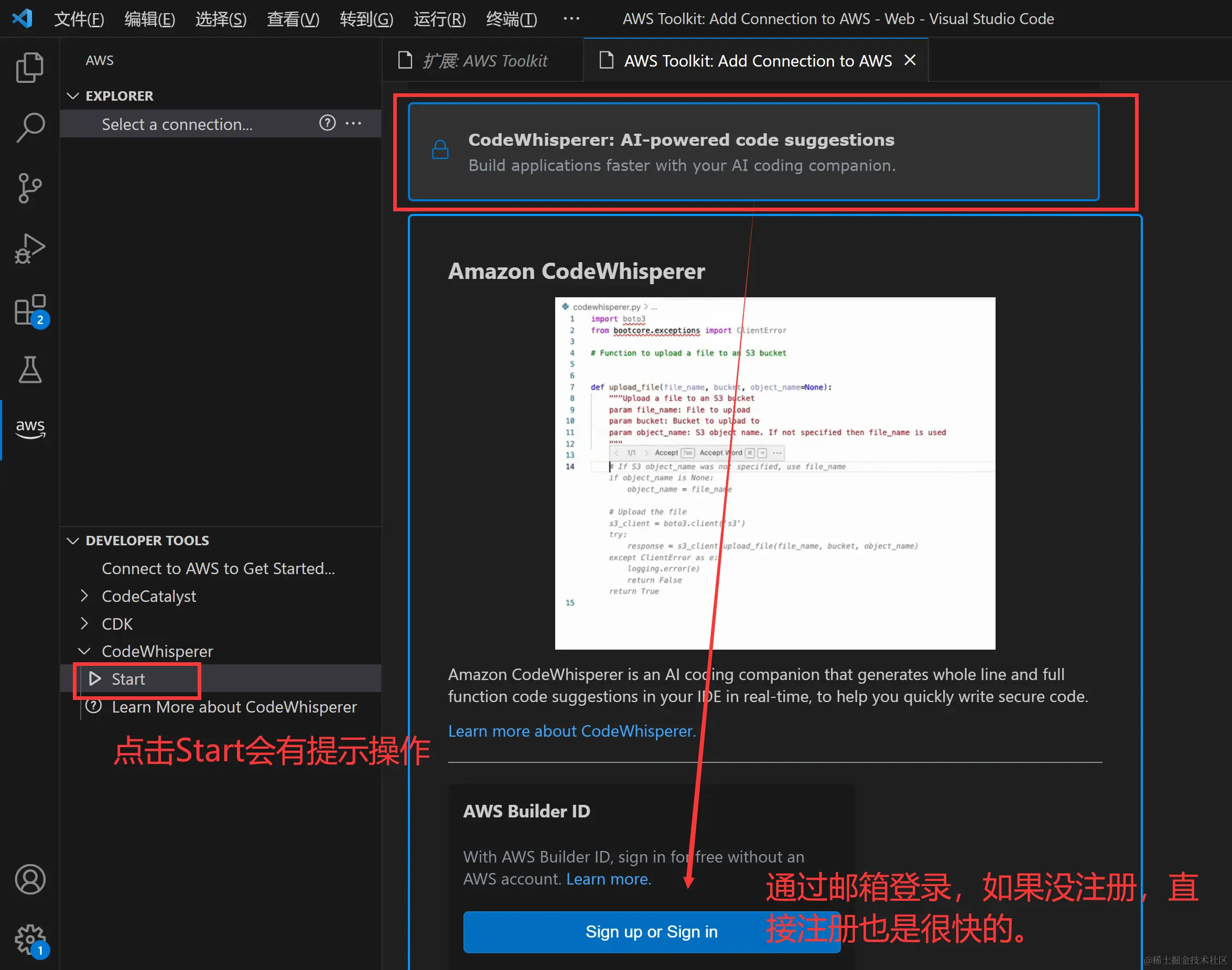 这里我们点击进入【aws】功能,看好了,需要在【CodeWhisperer】处点击【Start】,点击完毕后右侧菜单中的第二个带锁的【CodeWhisperer: AI-powered code suggestions】就会被展开,需要我们进行登录操作,没有账号的直接注册就可以,很方便的。