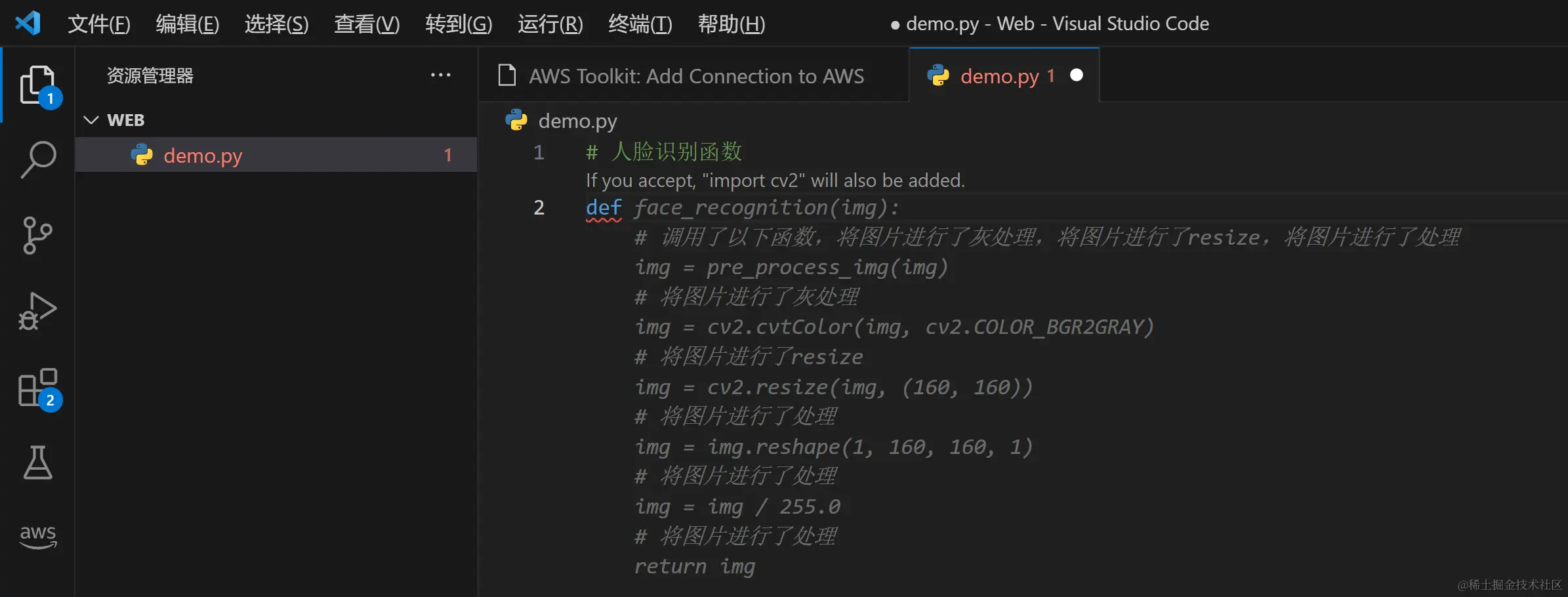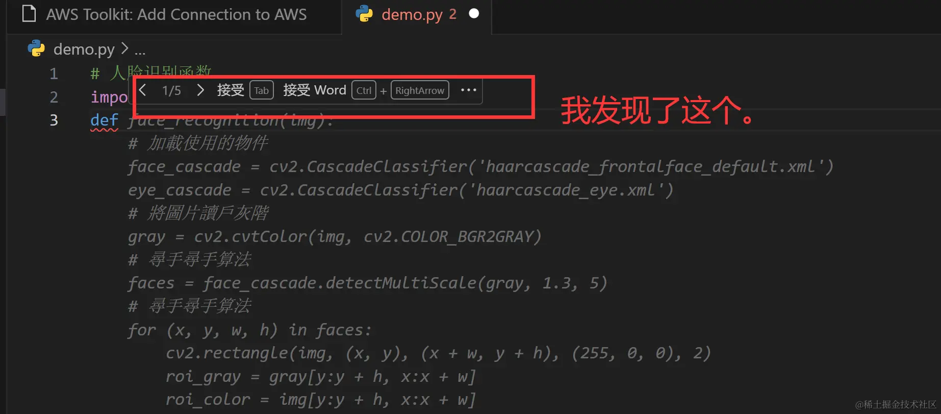 我们获取一个稍微复杂一个的测试:【# 人脸识别函数】,可以看到给予了cv2包的提示以及简单的函数处理,不过并没有对人脸进行识别,只是对图像做了一定的灰度以及压缩处理,有没有其它的提示呢?