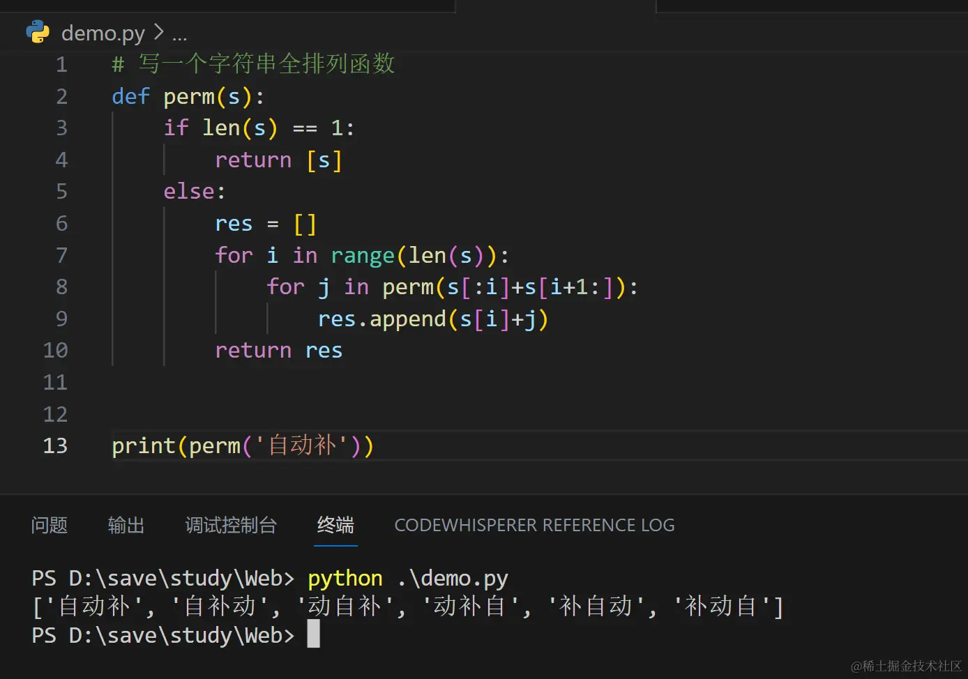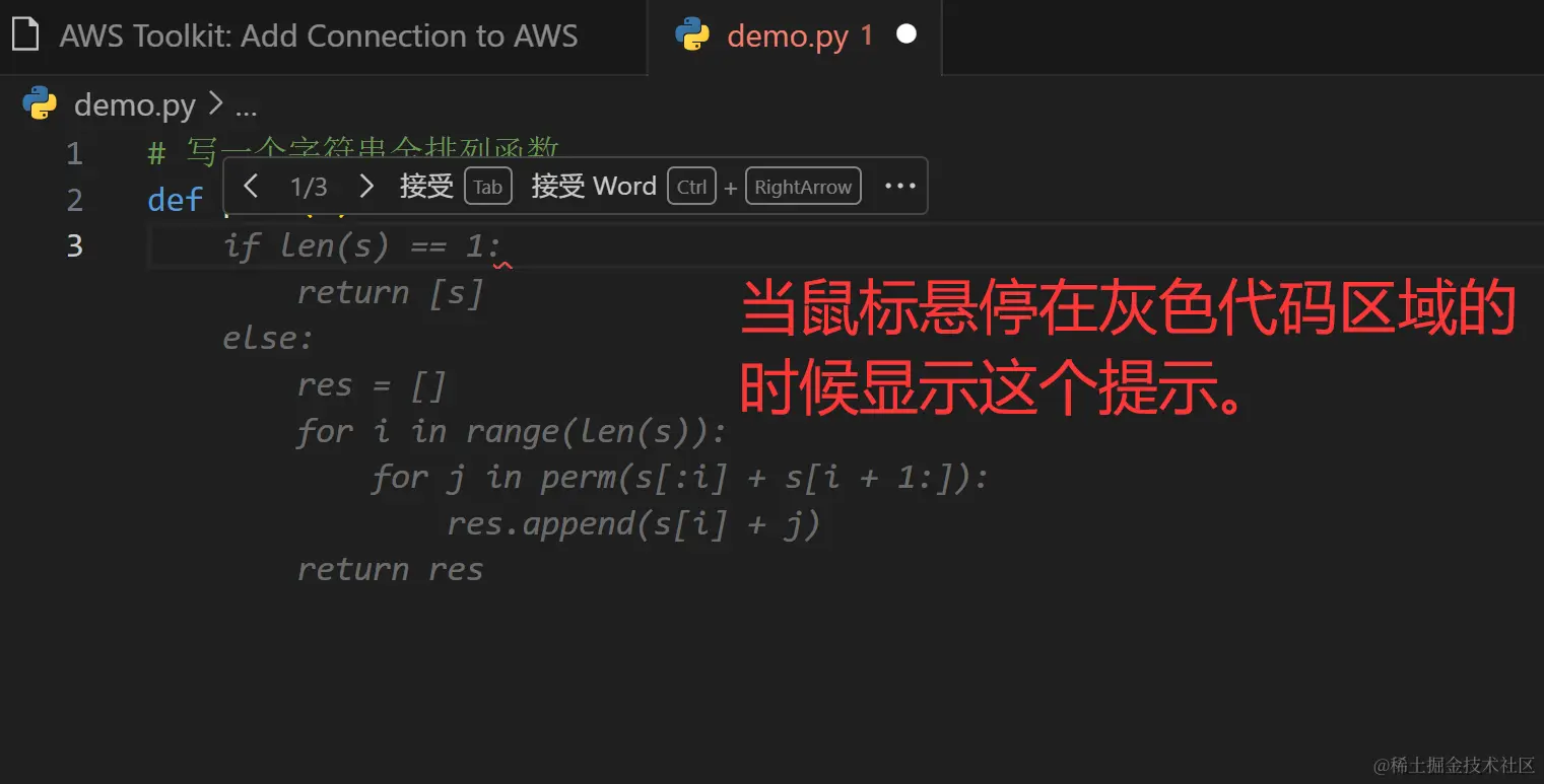发现过程,这里使用的注释是【# 写一个字符串全排列函数】,写了一个def,后面给了函数名称,当通过tab获取函数名称后我的鼠标正好悬停在灰色代码上,故而发现的这个提示功能。