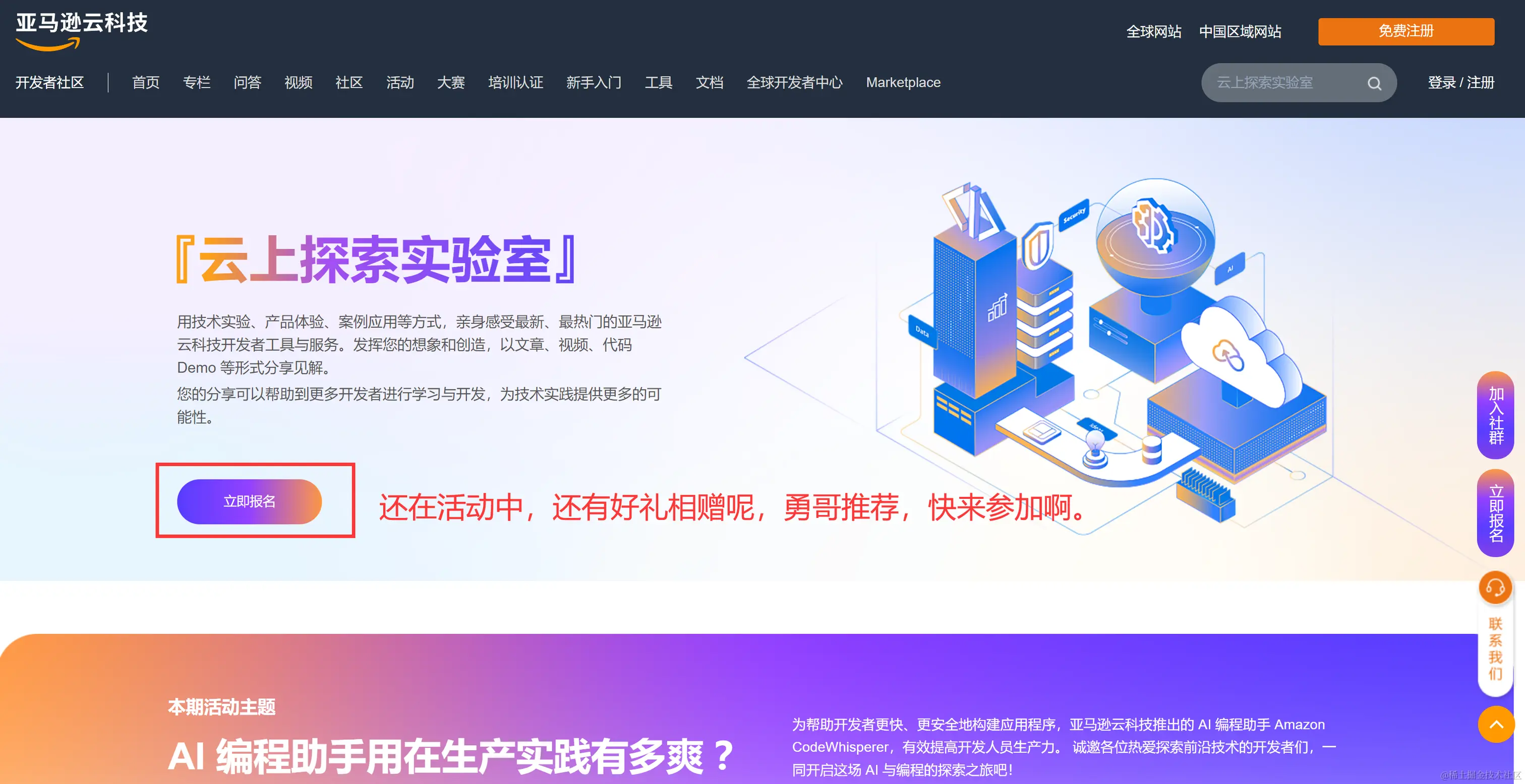 本篇文章致力于让更多的程序员们在生产实践中能节约更多的宝贵时间,更快、更安全地构建应用程序而发布。Amazon CodeWhisperer它提供了智能提示、代码自动补全和错误检测等功能,以支持开发人员的编码工作。在这里勇哥我特意的推荐给大家,让大家使着舒心,用的开心,并且当前还在活动期间,只要完成一些实践的上手操作,不仅仅能让大家掌握一个很好的插件编码开发助手,还有很多好礼相赠,大家快来参与吧。
