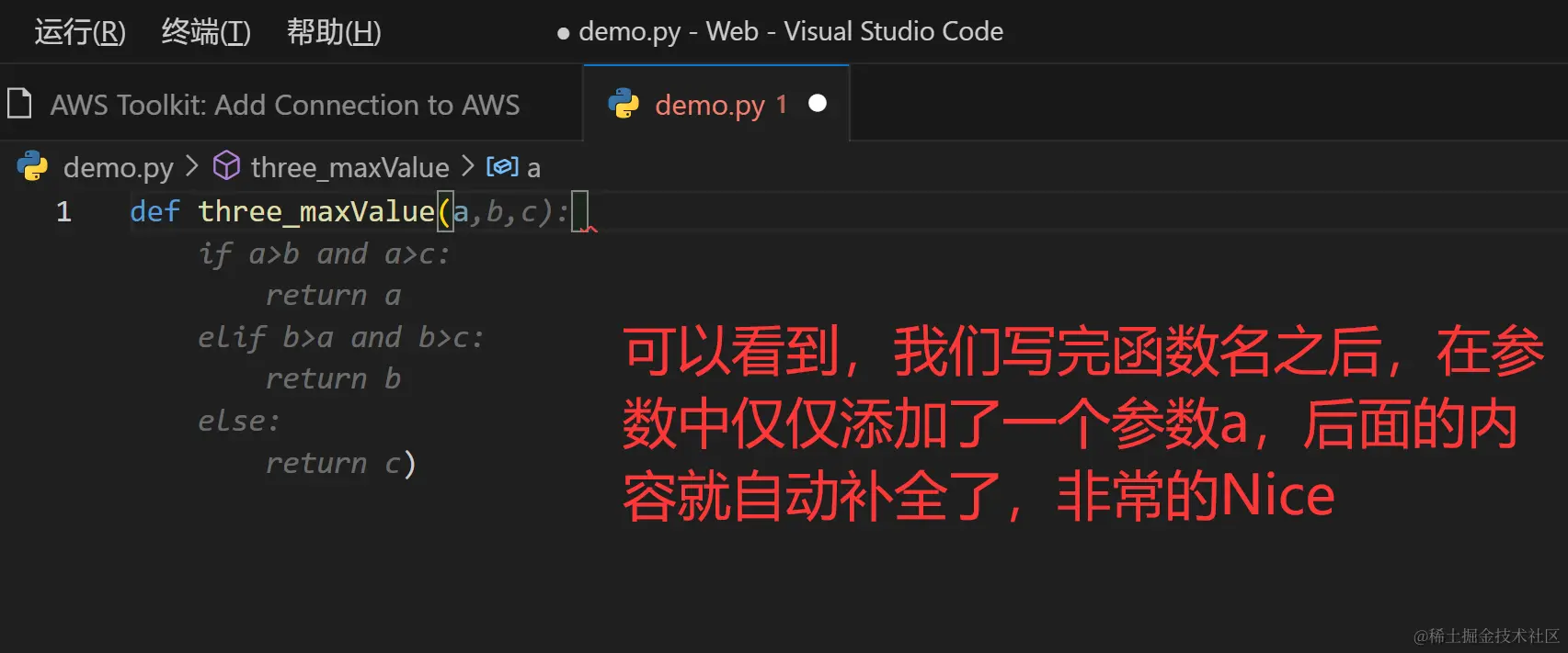 我们先试用Python语言测试一下,可以看到我们创建了一个py文件,仅仅写了一个def,它默认给了后面的add函数提示,但是很明显这个add函数不是我们想要的内容,例如,我们想要一个判断三个值其中哪个是最大值的函数。