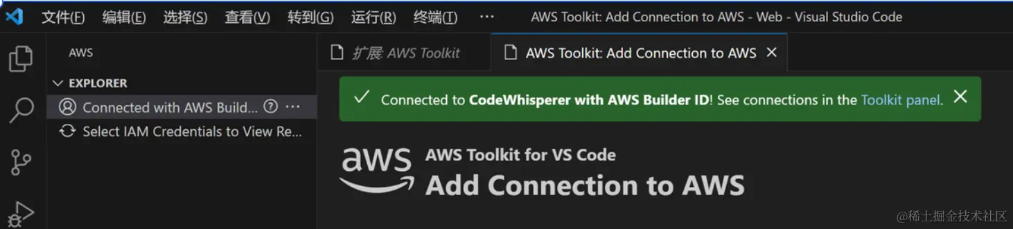 也就几秒钟过后就能看到告诉咱们可以在VSCode中使用【AWS Toolkit】了。