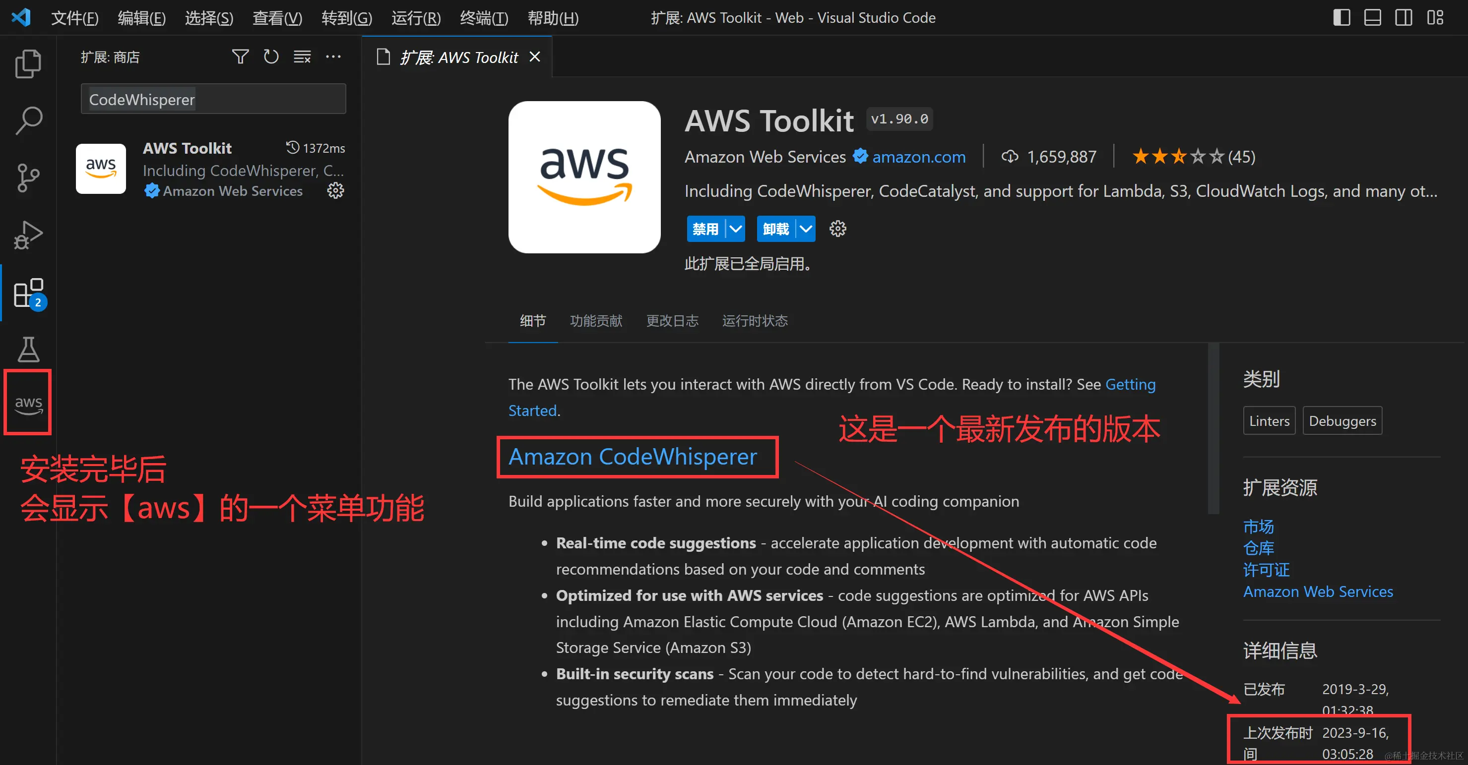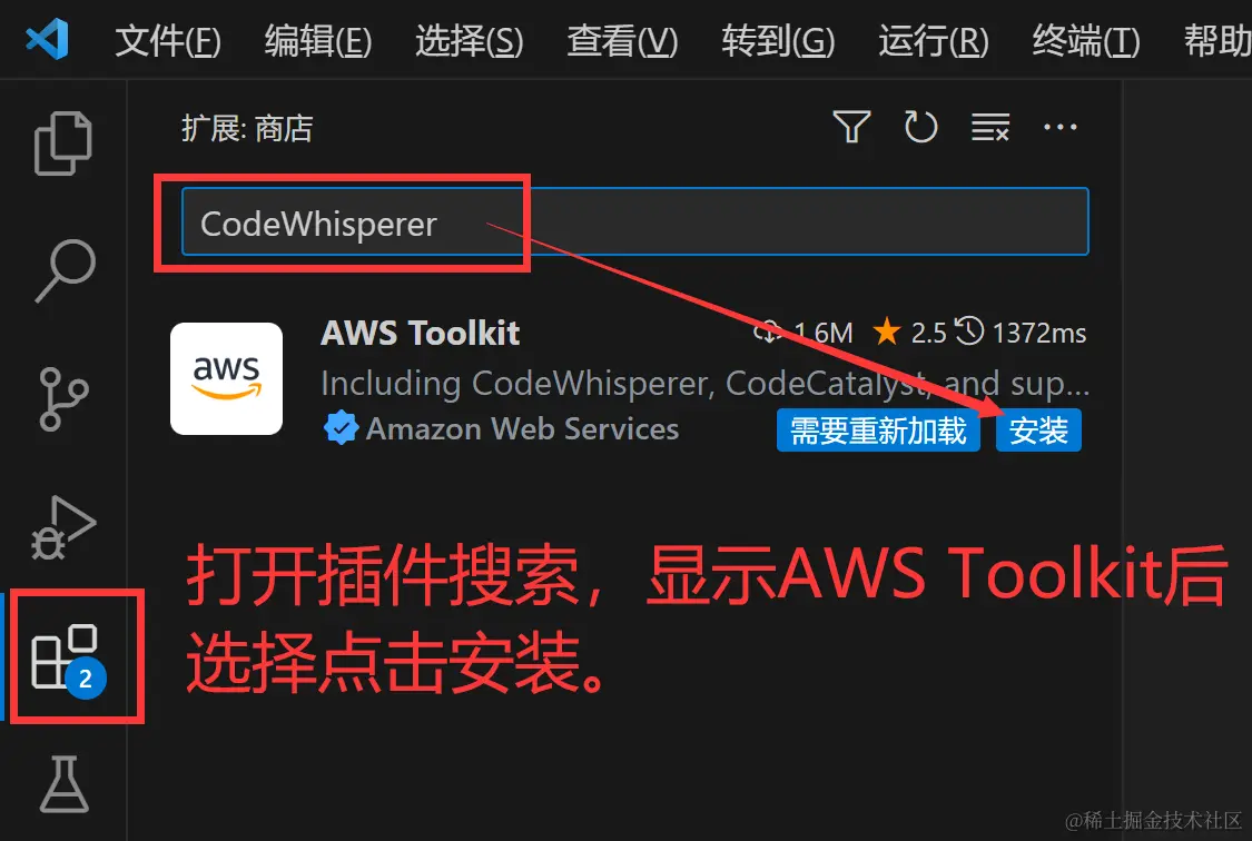 我们打开【Visual Studio Code】后,选择【扩展】功能(左侧列表的第五个功能),搜索【CodeWhisperer】,由于这个搜索是异步操作的,直接会显示【AWS Toolkit】的这个插件,我们直接点击【安装】按钮。