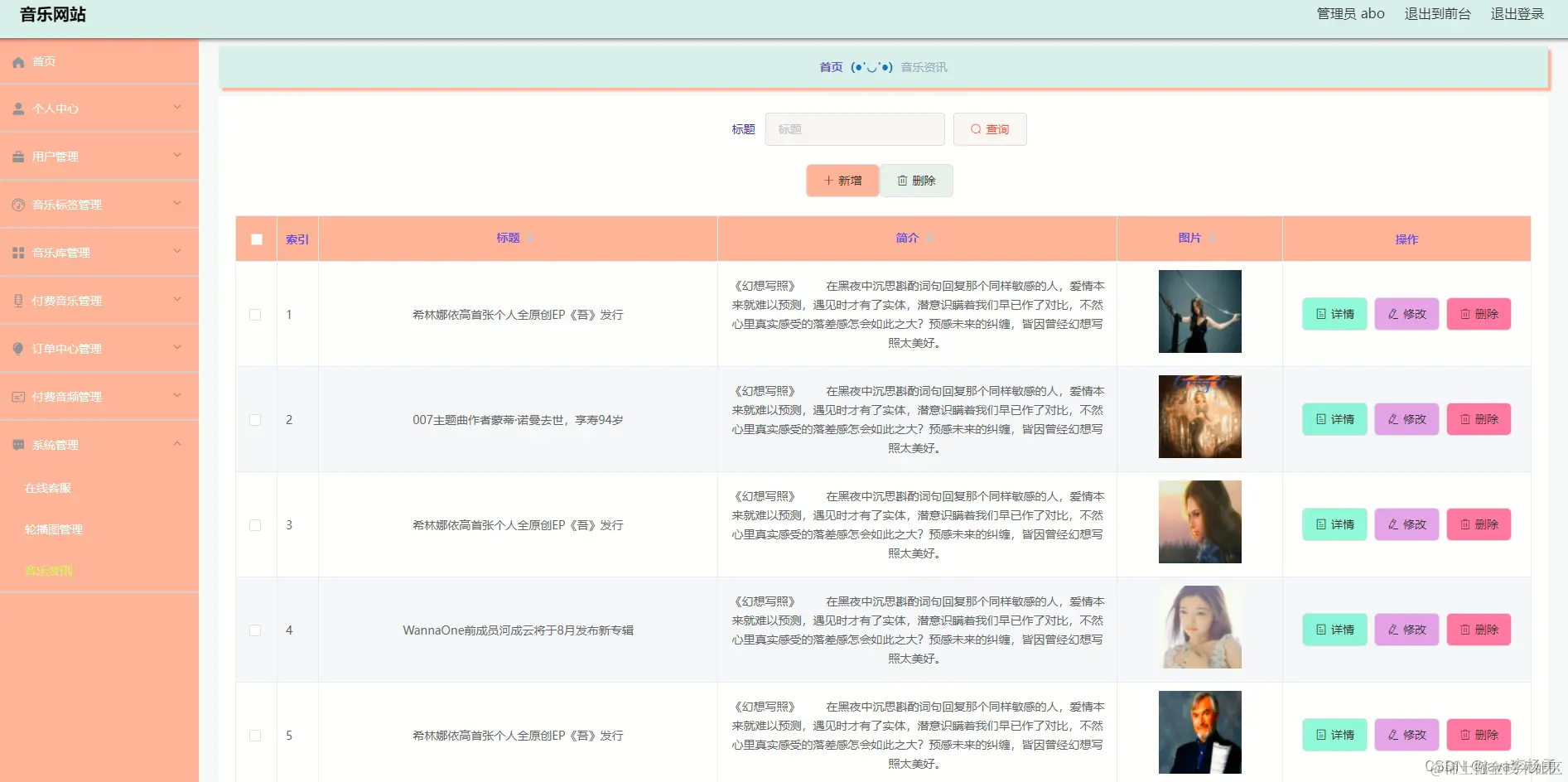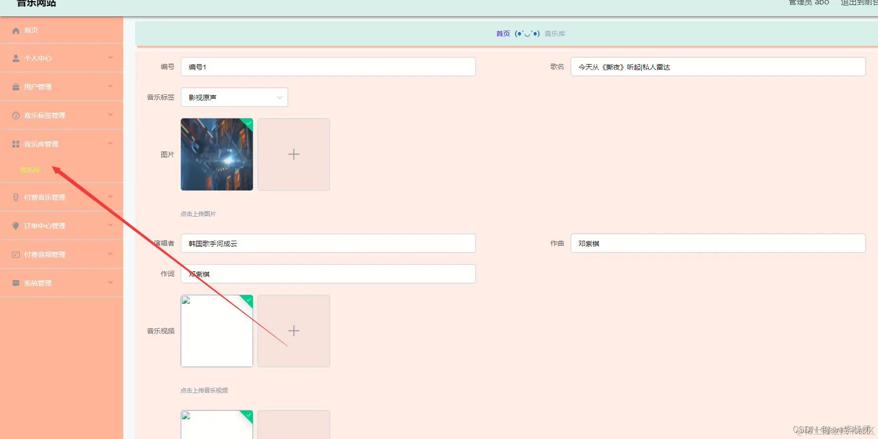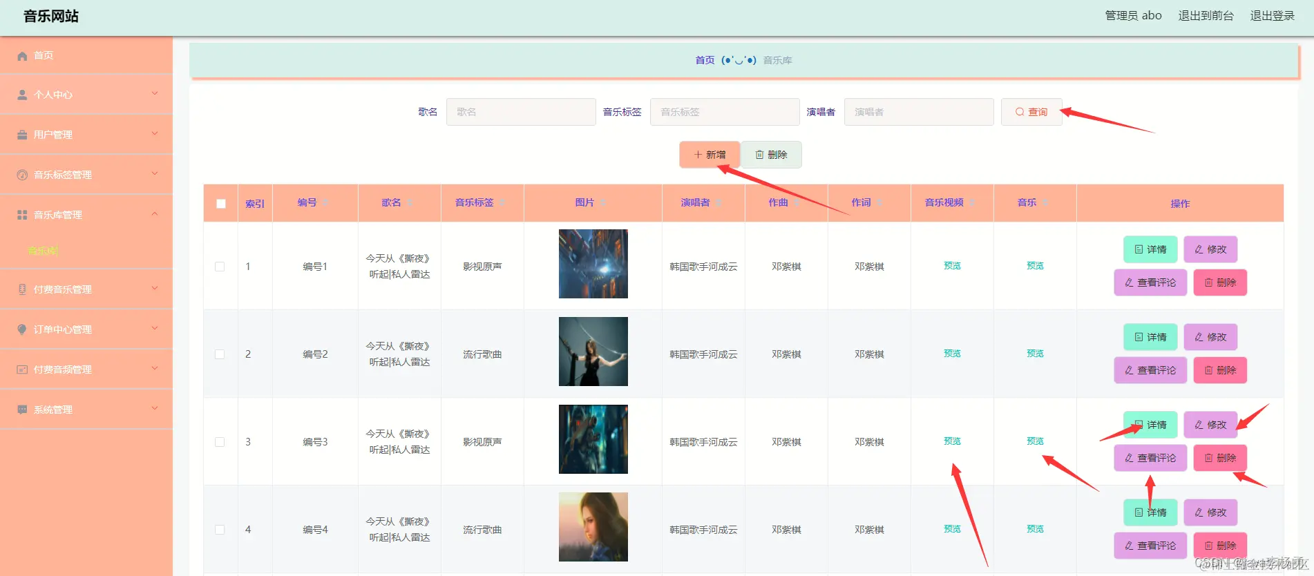 音乐库管理,通过内容列表获取编号、歌名、音乐标签、图片、演唱者、作曲、作词、音乐视频、音乐等信息可进行详情、修改、删除或查看操作